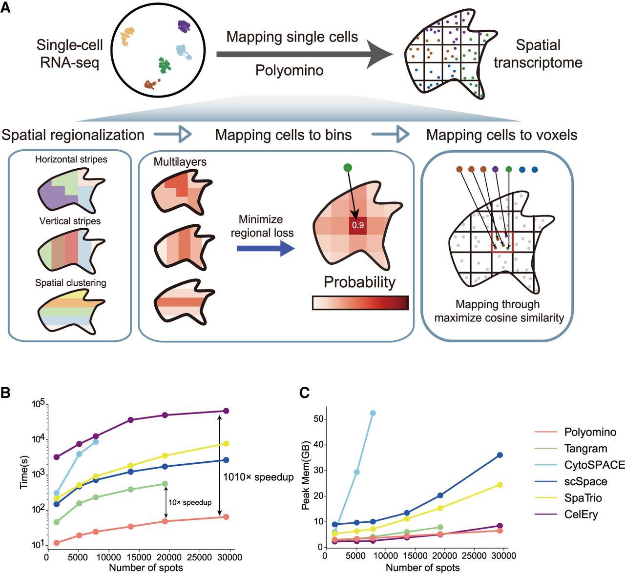 Schematic overview of Polyomino. (A) Polyomino is designed to accurately assign single-cell locations. Starting with spatial region expression formed from gridding the original ST data and single-cell seq data (left), Polyomino uses multilayer regional constraints to optimize the distribution of each cell in each grid (middle) and finally determine the precise location of cells within each grid through min cosine similarity cost (right). (B) Computation time of different methods when integrating 5000 single cells with varying voxel numbers. (C) Peak memory of different methods when integrating 5000 single cells with varying voxel numbers.