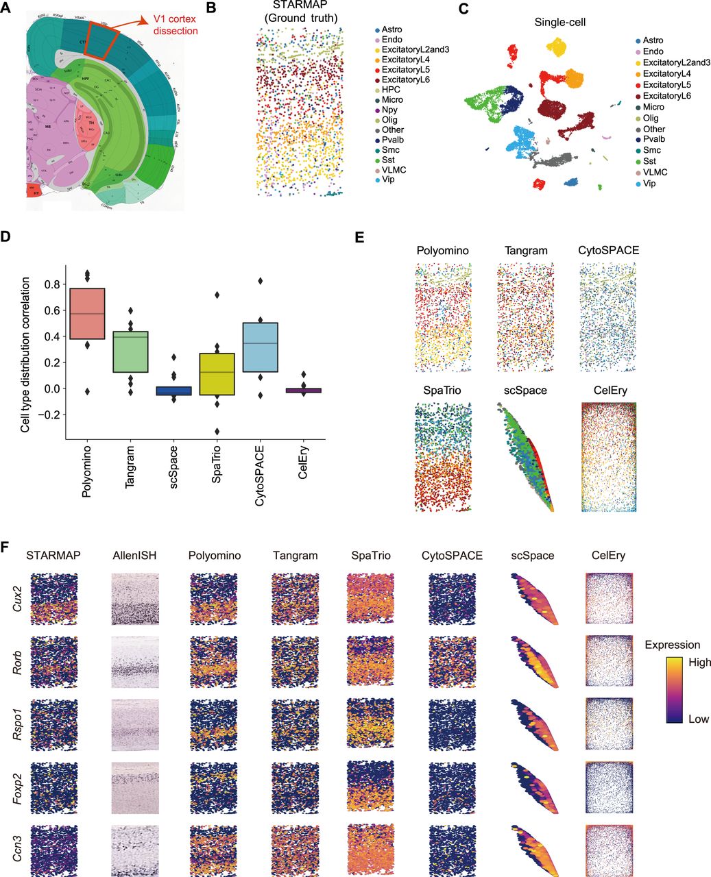 Evaluation in cerebral cortex data. (A) Tissue sections from cerebral cortex were used to generate spatial data (STARMAP) and snRNA data. (B) Spatial location of main cell types in the STARMAP data. (C) UMAP visualization of main cell types of the snRNA data. (D) Quantitative comparison of spatial reconstruction accuracy across six methods. Similarity was measured by correlating predicted cell-type distributions with the spatial ground truth. (E) Spatial mapping results from Polyomino and other representative methods. Polyomino achieves higher spatial concordance and sharper boundary definition of the cell types across cortical layers. (F) Comparison of reconstructed gene expression patterns. Polyomino better recapitulates the original spatial expression, demonstrating higher fidelity in gene-level reconstruction.