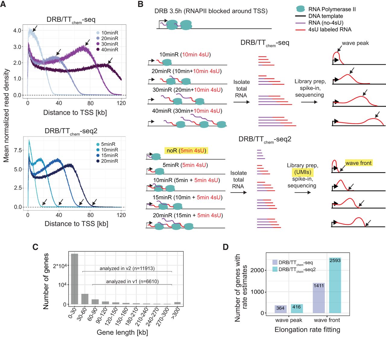DRB/TTchem-seq2 enables estimation of RNAPII elongation rates for a larger number of individual genes. (A) Metagene plots showing the mean read density of nonoverlapping protein-coding and lncRNA genes from DRB/TTchem-seq and DRB/TTchem-seq2 data sets. Read depths were calculated from the transcription start site (TSS) to 120 kbdownstream. Black arrows indicate the positions of the wave peaks in DRB/TTchem-seq data and wave fronts in DRB/TTchem-seq2 data. (B) Overview of the DRB/TTchem-seq2 method with major modifications relative to DRB/TTchem-seq highlighted. A control sample without DRB release (noR) was included, where cells were treated with DRB for the same duration as other samples. The time durations post-DRB release were shortened to 0, 5, 10, 15, and 20 min. Correspondingly, 4sU incorporation times were reduced to 5 min, with 4sU added during the last 5 min of the experiments. Library preparation remains similar to DRB/TTchem-seq but incorporates Unique Molecular Identifier (UMI) as part of the sequencing adapter for PCR duplicates identification. Following sequencing, RNAPII elongation progression was identified by the transcription wave fronts instead of the wave peaks (see Methods). (C) Distribution of gene lengths for human protein-coding and lncRNA genes. The numbers of genes included in the RNAPII elongation rate analysis for both DRB/TTchem-seq and DRB/TTchem-seq2 are indicated. (D) Bar plots comparing the number of genes with RNAPII elongation rate estimates calculated from the same number of reads in DRB/TTchem-seq and DRB/TTchem-seq2.The DRB/TTchem-seq raw sequencing data were previously published (Pappas et al. 2023).