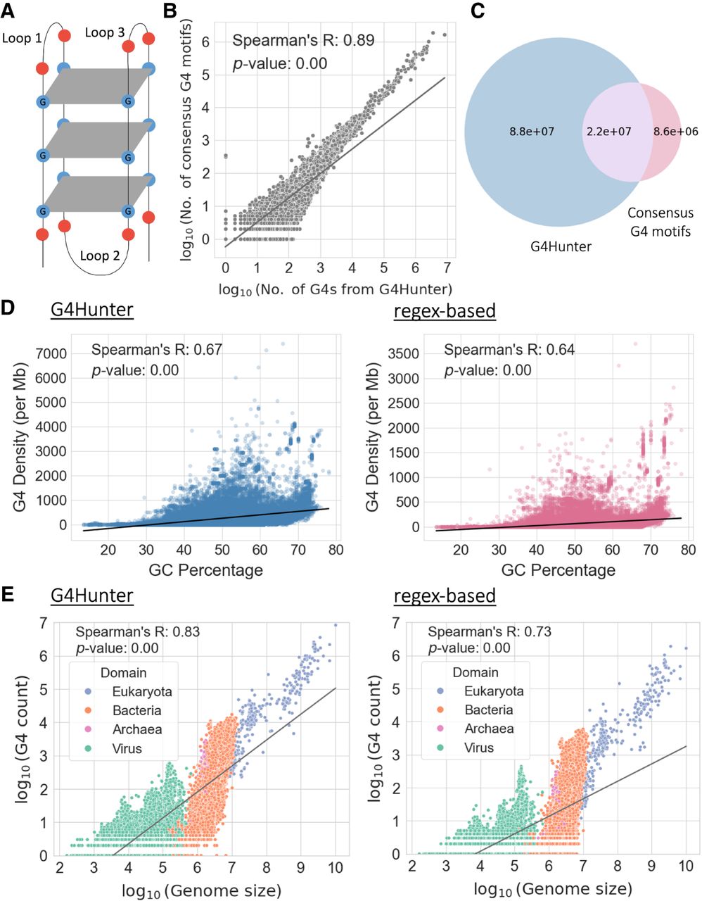 Characterization of G-quadruplexes (G4s) across 108,534 genomes. (A) Schematic illustration of a G4. (B) Scatter plot displaying the association between the number of G4s detected per species using G4Hunter (x-axis) and the regex-based (y-axis) algorithms. Values on both axes are represented in log10 scale. (C) Venn diagram showing the number of shared G4s found by the two methods. The blue circle represents the total number of G4s detected across all species using the G4Hunter method; the red circle represents the total number of G4 motifs detected using the regex-based algorithm across all species; and the overlapping purple region represents the G4s found using both methods. (D) Association between GC percentage and the number of G4s observed per million base pairs in each genome, based on G4s from G4Hunter (left) and G4 motifs detected from the regex-based algorithm (right). (E) Association between the length of the genome and the number of G4s detected, based on G4s from G4Hunter (left) and G4 motifs obtained from the regex-based algorithm (right). Values on both axes are represented in log10 scale. Each dot represents an organismal genome, and the color represents the taxonomic subdivision among the three domains of life and viruses that the organism belongs to. The lines in B, D, and E represent regression lines for the respective associations.