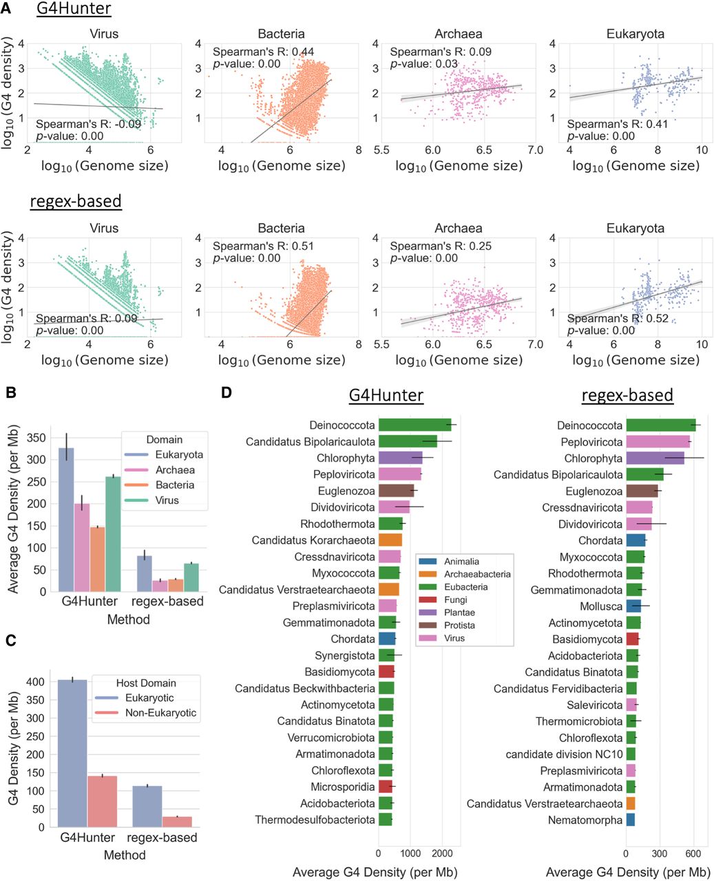 Taxonomic characterization of G4s across the tree of life. (A) Association between genome size and average G4 motif density (per million bases), categorized by the taxonomic subdivision among the three domains of life and viruses to which the organism belongs. Each dot represents an organismal genome, and the lines in each subplot represent the regression line for the respective associations. Values on both axes are represented in log10 scale. The subplots are based on G4s from G4Hunter (top row) and from the regex-based algorithm (bottom row). (B) Average density of G4s (per million bases) for organisms belonging to each domain of life and viruses. The error bars represent 95% confidence intervals. (C) Average density of G4s (per million bases) for viral genomes, categorized by their host domain (eukaryotic or prokaryotic). The error bars represent 95% confidence intervals. (D) Average density of G4s (per million bases) of organisms belonging to each phylum, based on G4s from G4Hunter (left) and G4 motifs detected using the regex-based algorithm (right). The plots include the top 25 phyla having the highest average G4 motif densities. The error bars represent SEM.