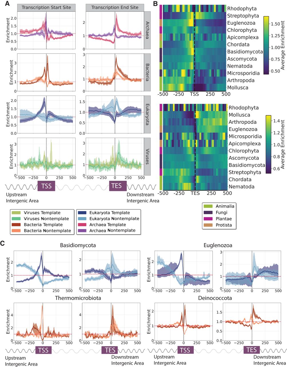The topography of G4s relative to transcription start sites (TSSs) and transcription end sites (TESs) across the tree of life. (A) G4 distribution across the three domains of life and viruses. Results are shown for the template and nontemplate strands separately. (B) Distribution of G4s relative to TSSs and TESs across eukaryotic phyla. (C) G4 distribution relative to TSSs and TESs for two eukaryotic phyla, Basidiomycota and Euglenozoa, and two bacterial phyla, Thermomicrobiota and Deinococcota. Results are shown for the template and nontemplate strands separately. Error bars represent the 2.5% lowest and 97.5% highest percentile from Monte-Carlo simulations with replacement (N = 1000).
