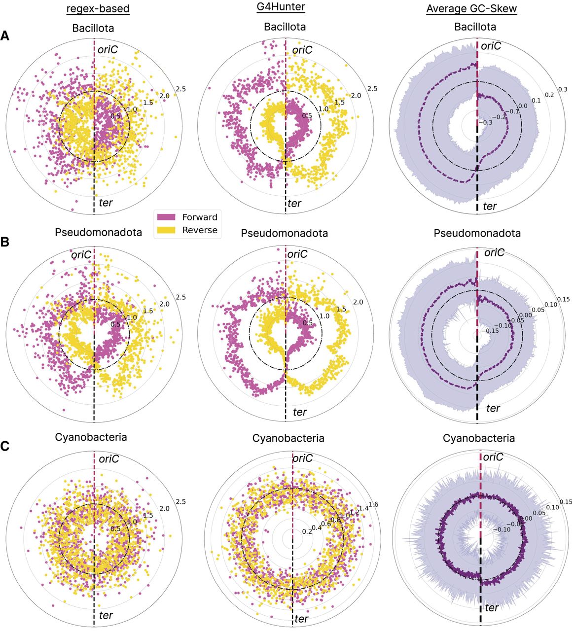 G4 distribution patterns relative to replication origins in bacterial phyla. Results shown for Bacillota (A), Pseudomonadota (B), and Cyanobacteria (C). Enrichment of G4s in forward- and reverse-strand orientation is shown in yellow and pink, respectively. Results are shown for G4 Hunter-based and regex-based algorithms. We discretized the circular bacterial chromosomes in 1001 bins, relative to oriC, for each calculating the total number of G4 sequences divided by the total number of G4s that span the whole chromosome, to estimate the local enrichment of G4s. The average GC skew is also calculated and shown in purple.
