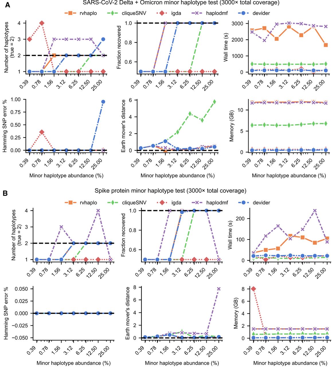 Benchmarking for two-strain SARS-CoV-2 synthetic sequencing mixtures at varying abundances. (A) Results for mixtures of full-length reads of Delta (major) and Omicron (minor) genomes. (B) Results for mixtures of reads that only cover the spike protein gene for the Delta and Omicron genomes.
