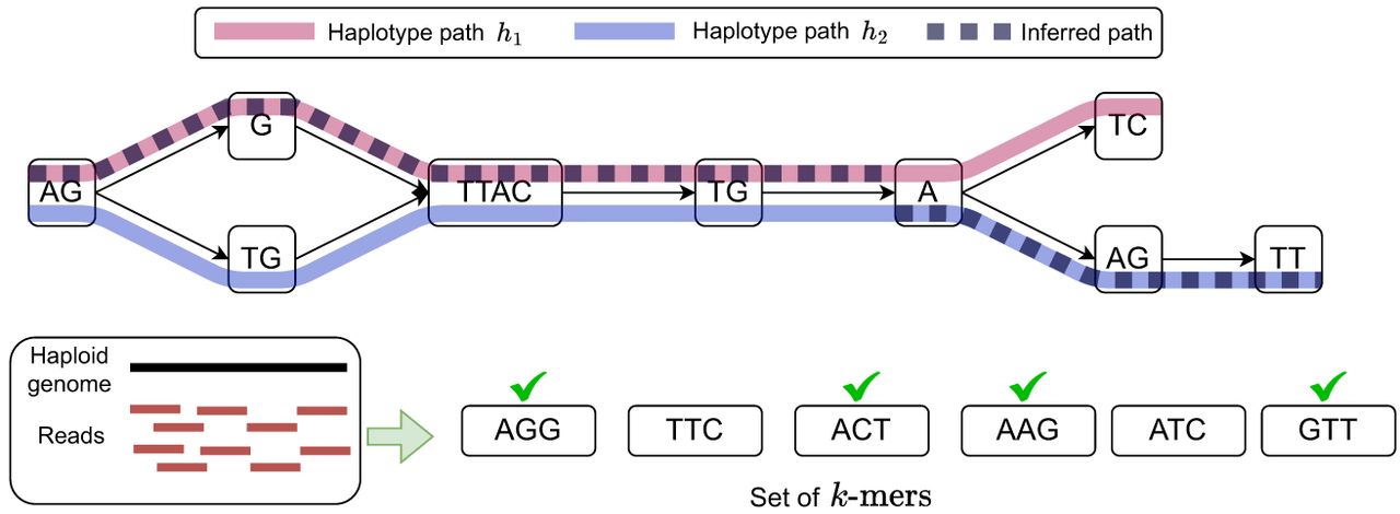 A schematic to illustrate the path inference problem. At the top, we show a haplotype-resolved pangenome graph containing two haplotype paths, h1 and h2. These paths are shown in pink and blue, respectively. An inferred path containing a single recombination is illustrated using a thick dashed line. At the bottom, we show a set of k-mers observed in the sequencing reads assuming k = 3. A k-mer is marked with a green tick if it is a substring of the sequence spelled by the inferred path AGGTTACTGAAGTT. Two k-mers (TTC and ATC) are not present in this sequence. Our optimization framework identifies an optimal inferred path with minimum cost given user-defined penalties for recombinations and for missing k-mers.