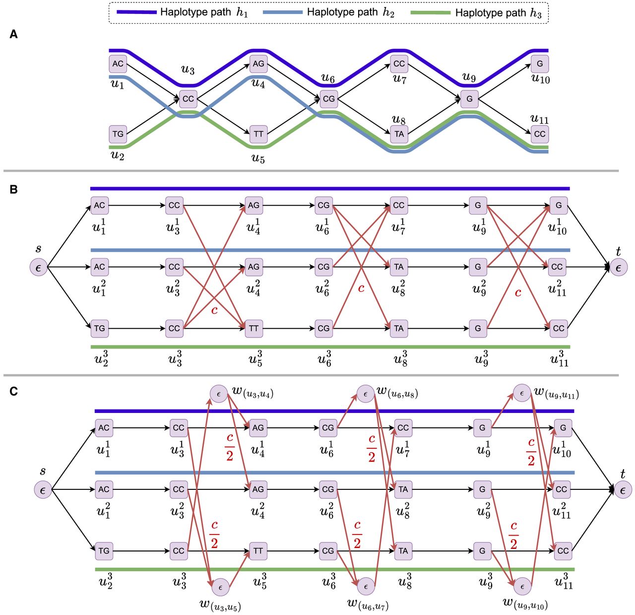 Illustration of an expanded graph. (A) A pangenome graph with three haplotype paths: h1, h2, and h3. (B) The corresponding expanded graph, which includes three disjoint paths, one for each haplotype path. The recombination edges are shown in purple; these edges have a weight of c. We consider only the useful recombinations (Lemma 1). The edges that are not recombination edges in the expanded graph have a weight of 0. (C) The corresponding optimized expanded graph.