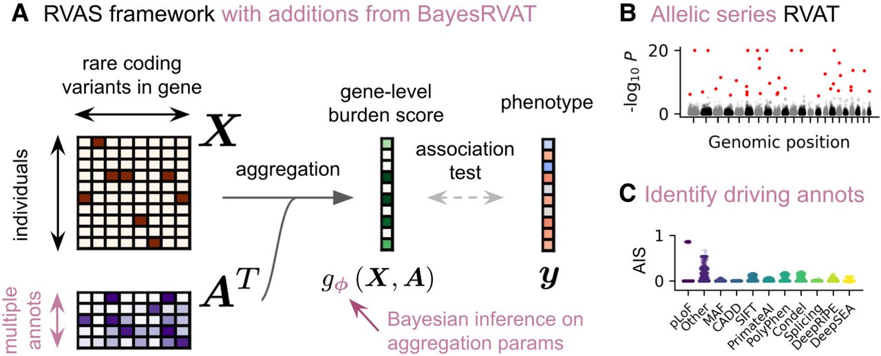 Overview of the BayesRVAT framework. (A) In rare variant association tests (RVATs), rare variants X and their annotations A are aggregated into a gene burden score, which is tested for association with the phenotype y. BayesRVAT explicitly introduces aggregation function gφ(X, A) and a prior over aggregation parameters ϕ. (B) BayesRVAT enables scalable gene burden testing accounting for multiple annotations. (C) It also provides annotation importance scores (AIS) for each analyzed gene–trait pair.