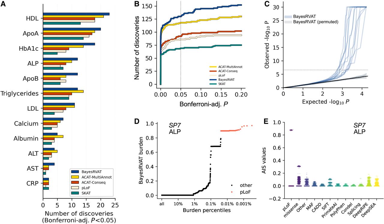 Analysis of blood biomarkers in the UK Biobank. (A) Number of significant gene–trait associations (Bonferroni-adjusted P < 5 × 10−2) discovered by BayesRVAT, ACAT-MultiAnnot, ACAT-Conseq, and pLoF burden tests for each analyzed blood trait. (B) Cumulative number of discoveries at varying Bonferroni-adjusted significance thresholds. (C) QQ plot showing the distribution of P-values from BayesRVAT in real data and under a null with permuted genotype data, confirming well-calibrated P-values. (D) Burden scores learned by BayesRVAT for SP7 and ALP across burden percentiles, showing individuals carrying pLoF mutations in red. (E) Annotation importance scores (AIS) from BayesRVAT for the association between SP7 and ALP, which highlights contributions from missense, DeepRiPE, and DeepSEA annotations.