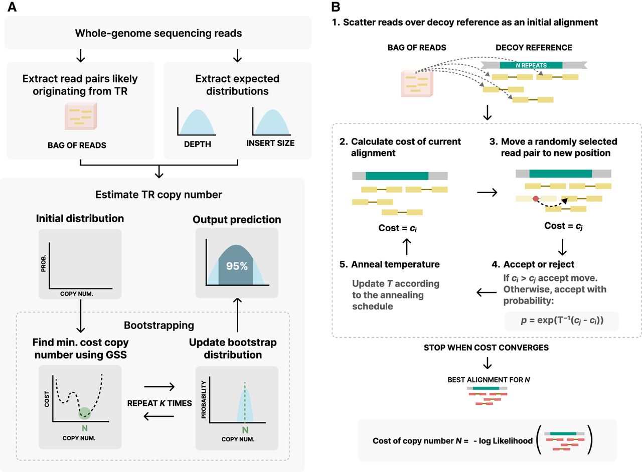 Overview of the ScatTR method. (A) Reads likely originating from the TR locus are collected from reference-aligned WGS data that include both mapped and unmapped reads to form the “bag of reads.” Additionally, the expected read depth and insert size distributions are extracted. These distributions are used as parameters in the likelihood function. TR copy number estimation is done with bootstrapping. ScatTR iteratively finds the copy number that minimizes a cost function using golden section search (GSS), and the result from each iteration is used to update a distribution of copy number estimates. After multiple iterations, this distribution is used to report a final estimate and a 95% confidence interval. (B) For a given copy number, ScatTR evaluates the cost by finding the best alignment to a decoy reference with the given number of repeat units. It starts with an initial alignment and then updates the alignment using Monte Carlo moves to reduce the cost and accept changes based on a probability function. This process is done via simulated annealing. It continues until convergence, yielding the best alignment for the given TR copy number. The best alignment is used to calculate the cost of the copy number, which is what GSS minimizes in A.