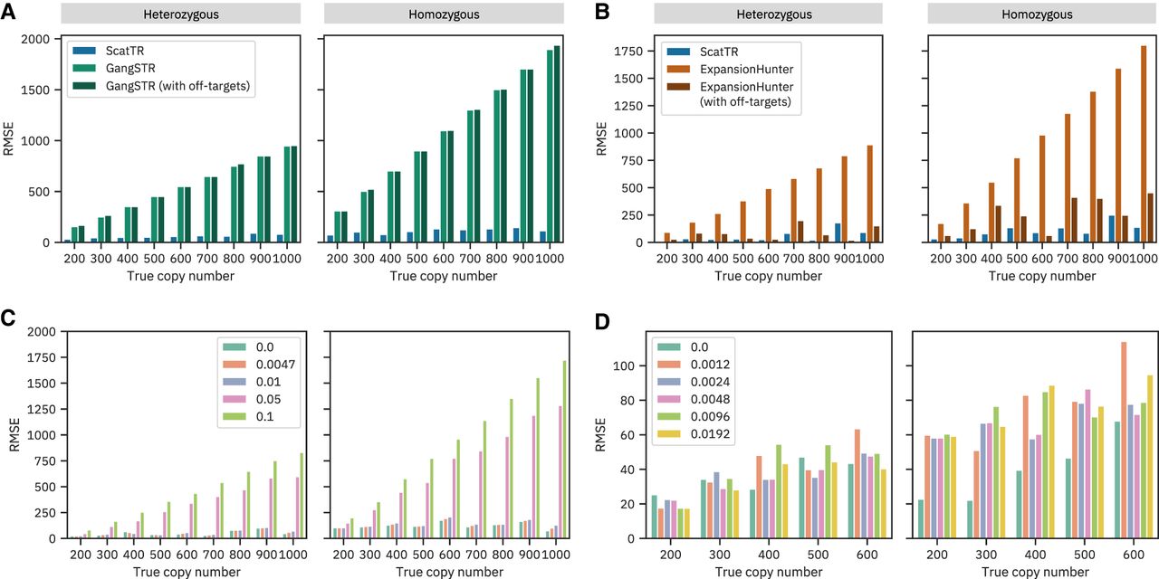Impact of off-target regions, mutation rates, and sequencing errors on ScatTR accuracy. (A) RMSE of ScatTR compared with GangSTR, with and without off-target regions, in 108 simulated samples across different true copy numbers. Heterozygous cases are shown on the left and homozygous on the right. The simulated samples represent expansions in 12 TR loci for which GangSTR provided off-target regions, including SCA1–3, SCA6–8, SCA12, SCA17, HTT, DM1, FMR1, and C9orf72. (B) RMSE of ScatTR compared to ExpansionHunter, with and without off-target regions, in 18 simulated samples across different true copy numbers. Heterozygous cases are shown on the left and homozygous on the right. The simulated samples represent expansions in two TR loci for which ExpansionHunter provided off-target regions, including C9orf72 and FMR1. (C) RMSE of ScatTR across varying mutation rates in the repeat sequence. (D) RMSE of ScatTR across different sequencing error rates in whole-genome sequencing (WGS) samples.