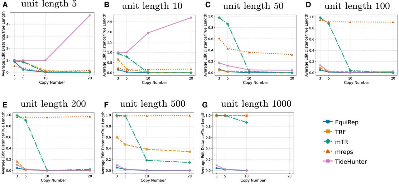 Comparison of average normalized rotation-aware edit distance on simulated data at a 10% error rate, for (A–G) unit lengths 5, 10, 50, 100, 200, 500, and 1000, respectively.