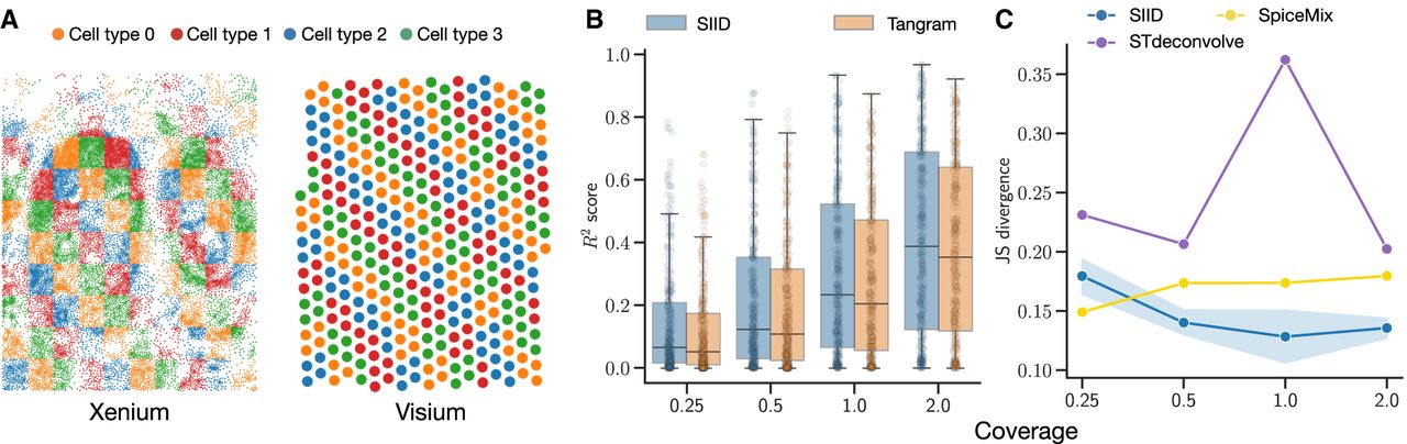 Evaluating SIID on simulated data. (A) A simulated Xenium and corresponding Visium data set with gene expression of cell types obtained from a matching scRNA-seq data set (Janesick et al. 2023). (B) R2 of imputed gene expression for holdout genes from SIID and Tangram stratified by coverage. (C) Average Jensen-Shannon (JS) divergence between ground truth and predicted cell type mixture proportions predicted by SIID, STdeconvolve, and SpiceMix for simulated Visium data over all spots stratified by coverage.