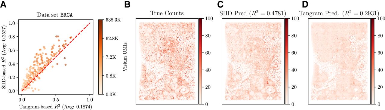 Analysis of SIID imputation on breast cancer (BRCA) data. (A) Comparison of holdout R2 score of SIID (y-axis, correlation score averaged over five runs) and Tangram in cell mode (x-axis) for each gene in the Xenium panel for the BRCA data set. Each point on the plot corresponds to a single gene, whose color corresponds to the number of Visium UMIs mapped to the gene on a log-scale. Genes above the red y = x line have higher imputation performance for SIID compared to Tangram. (B) Expression of gene ZEB2 in Xenium (ground truth for evaluating imputation), (C) SIID prediction of ZEB2 expression when the gene is held out (R2 = 0.4781 against the ground truth). (D) Tangram prediction of ZEB2 expression (R2 = 0.2931 against ground truth). Total counts of each gene over all cells are normalized to 1,000,000, and normalized counts are shown on the same color scale in B, C, and D.