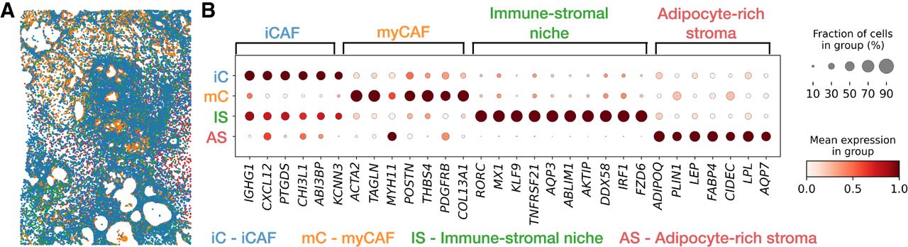 Stromal cell subtype analysis. (A) Spatial distribution of stromal cells in Xenium data with four annotated cell subtypes. (B) Marker gene expression for the annotated cell subtypes within the stromal cell type in Xenium data.