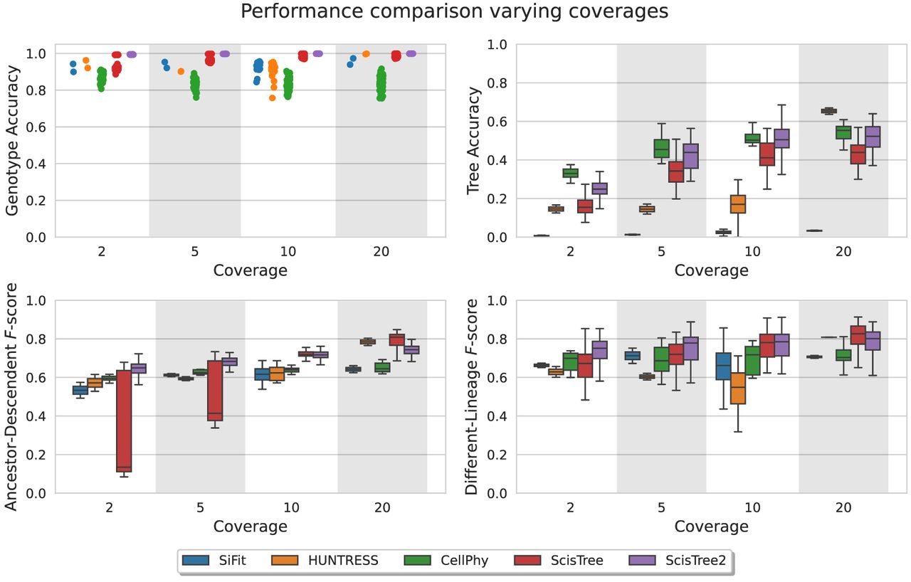 Performance comparison on various coverage (per site per cell). x-axis: coverage at 2×, 5×, 10×, and 20×). y-axis: performance metric.