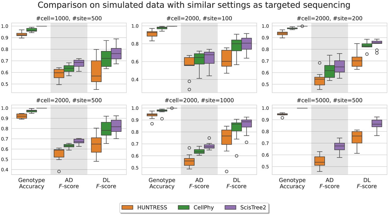 Comparison on simulated data with settings similar to targeted single-cell sequencing data with more cells and fewer sites. Tree accuracy is very low for all methods and is not shown.