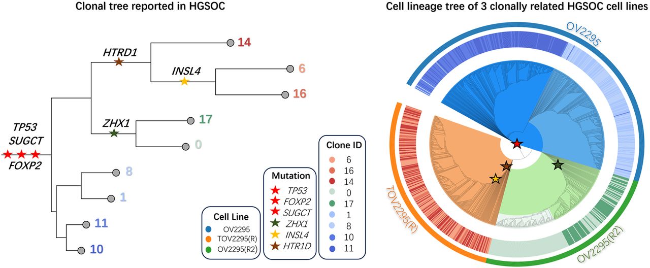 Analysis of the HGSOC data by ScisTree2. Left: The clonal tree of HGSOC with six mutated genes considered important for cancer development in the original study (Laks et al. 2019). Number at a leaf: clone ID (with a distinct color). Right: Reconstructed cell lineage tree of tumor cells (colored w.r.t. their clones) with the same genes mapped on. Outer ring: three cell lines OV2295, TOV2295(R), and OV2295(R2). Inner ring: (colored) clones from the original study. Genes marked as red stars are ancestral genes, whereas others are clade genes.