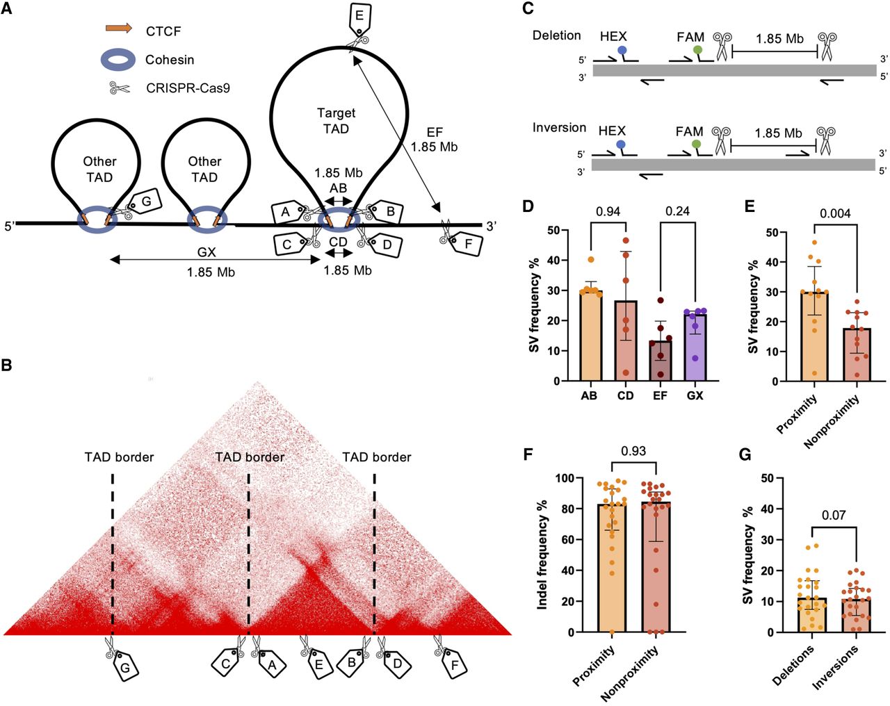 The effect of spatial proximity on SV frequency in K562 cells. (A) Six TADs were identified in K562 cells and named according to their position: Chr 2, Chr 6, Chr 10, Chr 17, Chr 21, and Chr X. Seven sgRNAs were designed for each TAD to investigate spatial proximity effects: sgRNAs A and B, which targeted sequences inside the CTCF motif at the left and right TAD border; sgRNAs C and D, which targeted sequences outside the CTCF motif at the left and right TAD border; sgRNA E, which targeted an intra-TAD sequence; sgRNA F, which targeted a sequence outside the TAD; and sgRNA G (or H, not shown), which targeted a sequence inside the CTCF motif of a neighboring TAD. Individual sgRNAs were electroporated into K562 cells in separate pairs as AB, CD, EF, and GX (X could be sgRNA A, B, or H). All pairs would have the same distance in base pairs between them, but AB and CD would be in spatial proximity, whereas EF and GX would be spatially distant. (B) An example Hi-C map of the Chr 6 TAD. (C) Illustration of the gain-of-signal ddPCR assay with primers surrounding the cut sites of the sgRNA pair and the binding site of the FAM probe. The HEX probe included to adjust for locus copy number is also illustrated. (D) SV frequencies (deletions + inversions) for AB, CD, EF, and GX sgRNA pairs (n = 6 sgRNA pairs in each group; six chromosome loci with one sgRNA pair); P-values from Mann–Whitney U test. (E) SV frequencies between proximity and nonproximity sgRNA pairs (n = 12 sgRNA pairs in each group; six chromosome loci with two sgRNA pairs); P-value from Mann–Whitney U test. (F) Individual sgRNA efficiencies measured by their ability to induce indels (n = 24 sgRNAs in each group; six chromosome loci with four sgRNAs); P-value from Mann–Whitney U test. (G) Frequencies of deletions and inversions for all sgRNA pairs (n = 24 sgRNA pairs in each group; six chromosome loci with four sgRNA pairs); P-value from Wilcoxon matched-pair signed-rank test. The observations are biological replicates, and the error bars show the median and IQR.