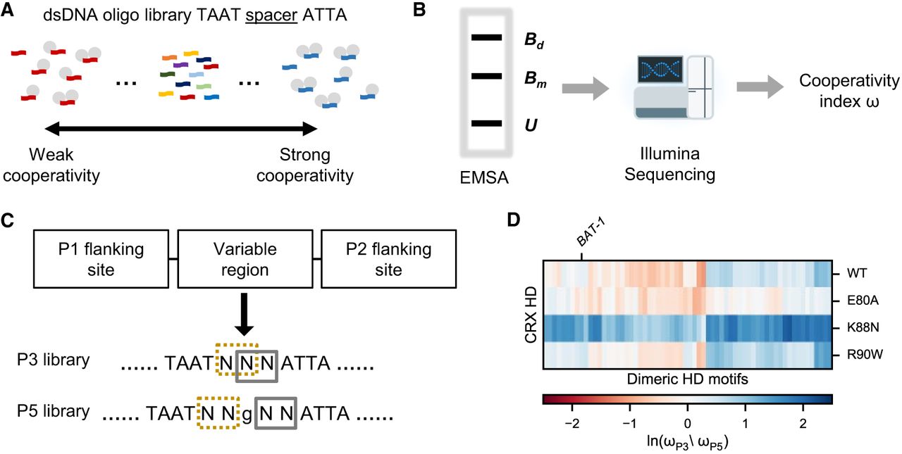E80A and K88N mutations differently affect CRX HD DNA-binding cooperativity at P3 sequences. (A,B) Schematics showing the Coop-seq experimental pipelines. dsDNA oligo pools of P3 and/or P5 Coop-seq library are incubated with different HD peptides. The dimeric and monomeric binding complexes are separated from unbound DNAs by EMSA. DNAs are extracted from all three DNA bands and subjected to quantification by Illumina sequencing. (Bd) Dimeric band, (Bm) monomeric band, and (U) unbound band. (C) Diagram depicting the Coop-seq library design and strategy to match a P3 sequence with a P5 counterpart. Exact oligo sequences can be found in Supplemental Table S1. (D) Heatmap comparing the relative cooperativity of WT and variant CRX HDs on P3 and P5 libraries (ωp3/ωp5). Note the relative cooperativity is presented in the logarithmic scale and ordered by unsupervised hierarchical clustering. The ordered relative cooperativity matrix can be found in Supplemental Table S3.