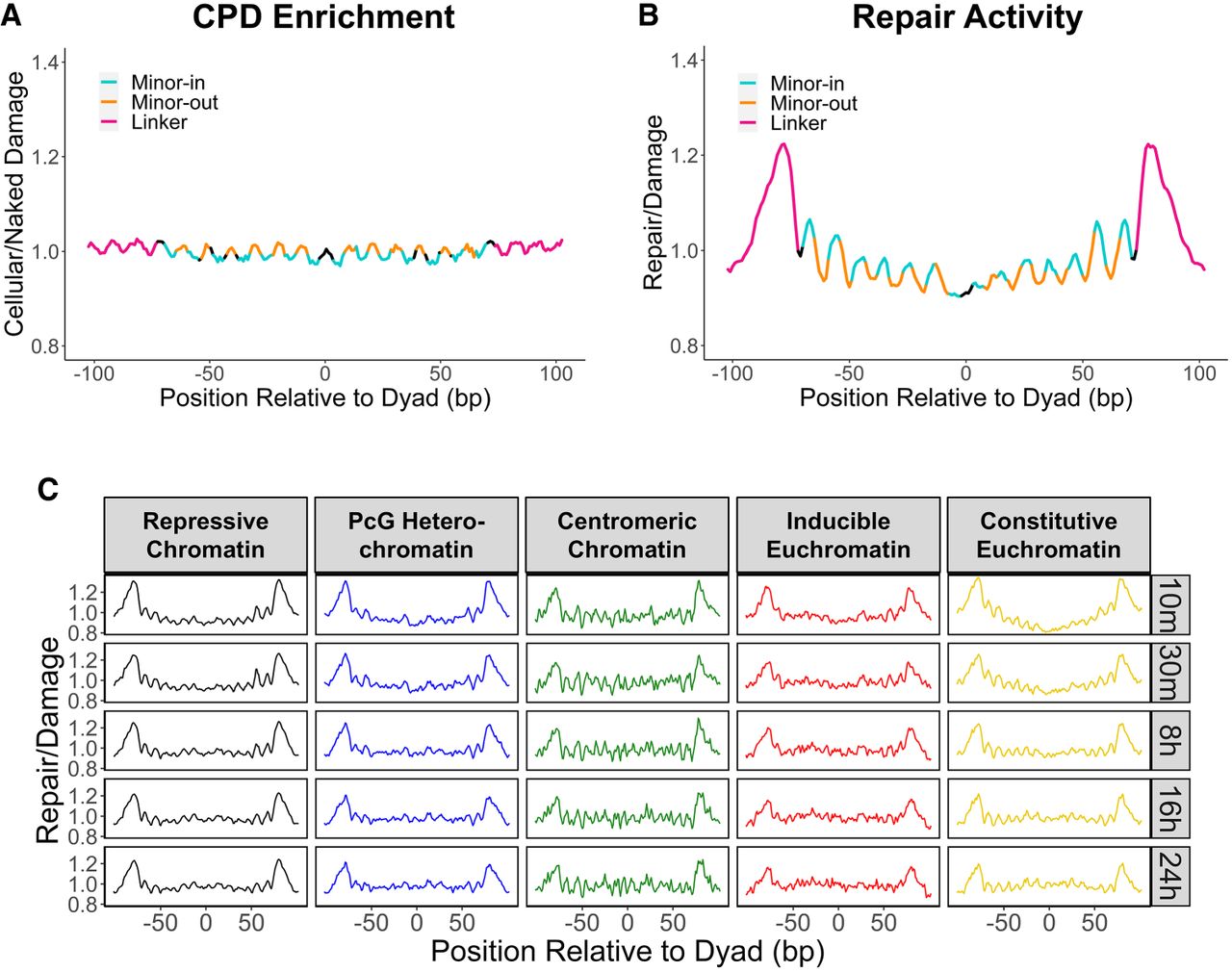 Repair of CPDs is faster in linker DNA regardless of chromatin state. (A,B) Relative CPD enrichment (A) and repair activity (30 min; B) with respect to rotational nucleosome positioning. The CPD enrichment data used to generate plot A are the same as in Fig. 1C, but both axes have been expanded to include linker DNA and highlight differences in amplitude compared with repair data (B). (A) CPD enrichment is normalized to a UV-exposed, naked DNA control. (B) Repair data are normalized to cellular damage data. (C) CPD repair activity within 103 bp of nucleosome dyads, stratified by chromatin type and time point. The data in C were scaled for each subplot so that they have a uniform mean of one.