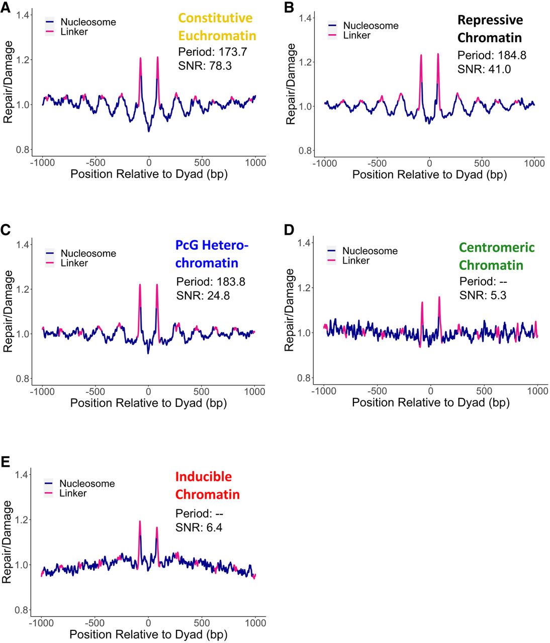 Translational CPD repair periodicities vary in strength and period across chromatin types. (A–E) CPD repair activity (30 min) with respect to translational nucleosome positioning for constitutive euchromatin (A), repressive chromatin (B), PcG heterochromatin (C), centromeric chromatin (D), and inducible euchromatin (E). All repair data are normalized to cellular damage data. Periods were not assigned to centromeric chromatin (D) and inducible euchromatin (E) owing to the diminished SNR values.