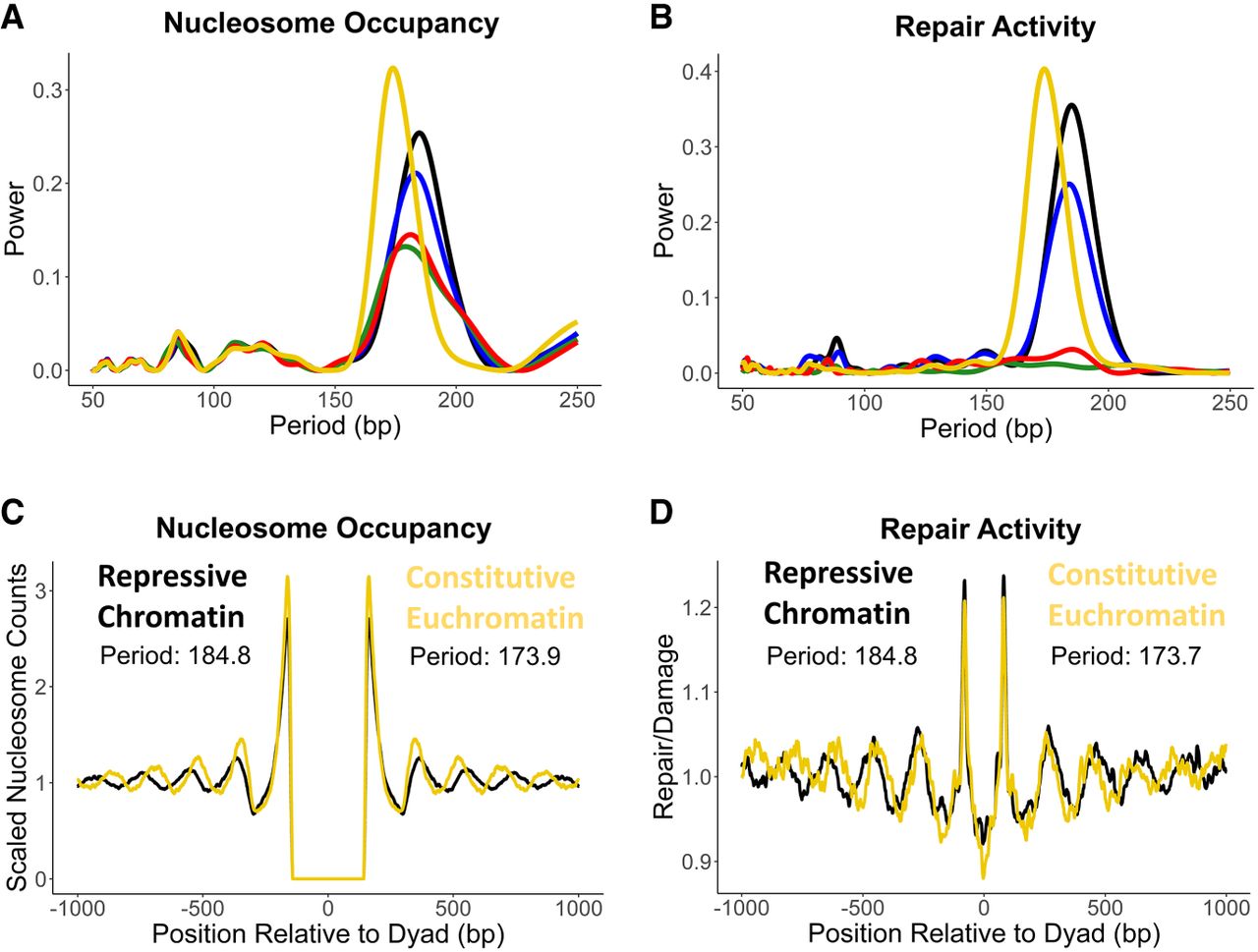 Translational CPD repair periods and nucleosome repeat length vary in tandem across chromatin types. (A,B) Lomb–Scargle periodograms showing nucleosome occupancy (A) and CPD repair (B) periodicities for each chromatin type. Black trend lines represent repressive chromatin; blue trend lines, PcG heterochromatin, green trend lines, centromeric chromatin; red trend lines, inducible euchromatin; and yellow trend lines, constitutive euchromatin. (C,D) Overlaid constitutive euchromatin and repressive chromatin translational patterns for nucleosome occupancy (C) and CPD repair activity (30 min; D). Nucleosome dyads were never called within 147 bp of one another, so the region from −147 to 147 bp in the nucleosome occupancy data (C) was excluded from the periodicity analysis.
