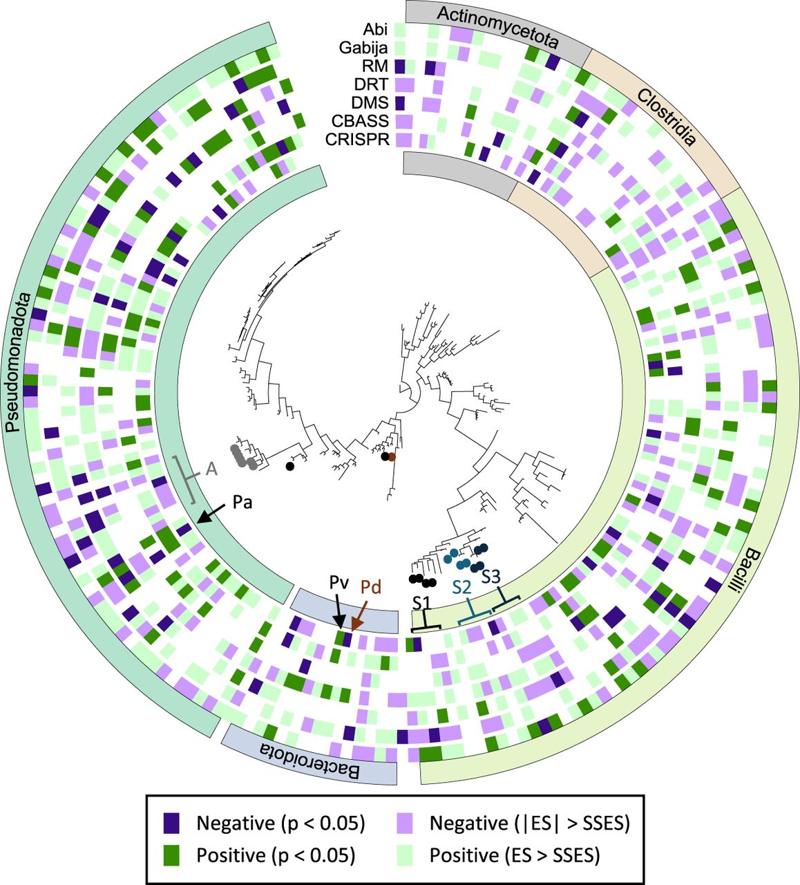 Taxonomic distribution of species displaying positive and negative associations between the presence of defense systems and the number of genes from the mobilome (based on COG annotations). Taxa discussed in the text are labeled: (A) Acinetobacter; (Pa) Pseudomonas aeruginosa; (Pv) Phocaeicola vulgatus; (Pd) Phocaeicola dorei; (S1) Streptococcus pyogenes, Streptococcus dysgalactiae, Streptococcus equi, and Streptococcus uberis; (S2) Streptococcus gordonii, Streptococcus anginosus, Streptococcus mutans, and Streptococcus salivarius; and (S3) Streptococcus oralis, Streptococcus intermedius, and Streptococcus suis. The classes Bacilli and Clostridia are the major components of the Genome Taxonomy Database phyla “Bacillota” and “Bacillota_A.” Note that, because of cross-species differences in statistical power, the condition |ES| > SSES does not necessarily imply statistical significance. For a larger version including all species names, see Supplemental Figure S3.