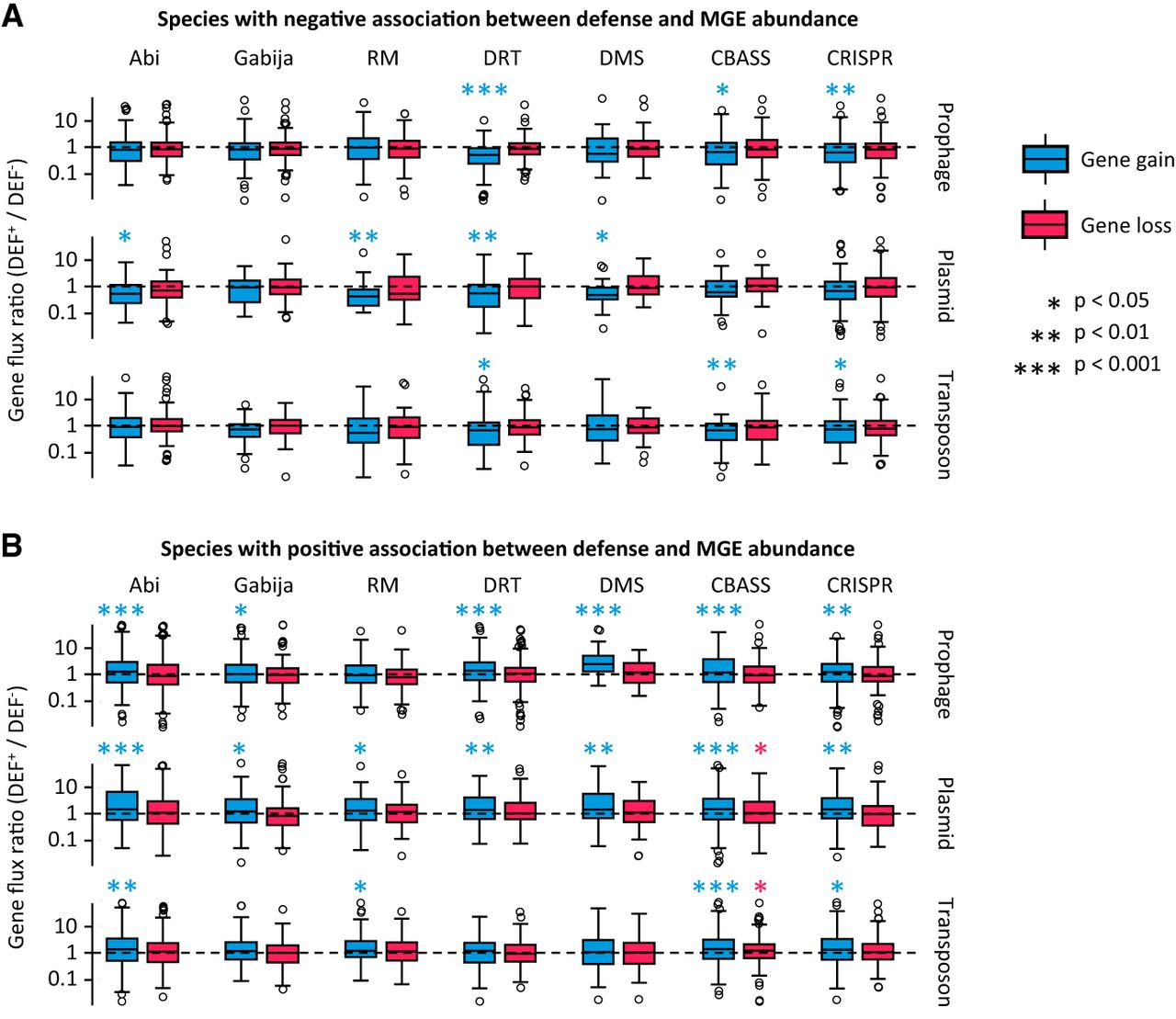 Relative differences in the rates of gene gain and loss between sister clades that do and do not harbor defense systems (DEF+ and DEF−, respectively). The boxplots represent the distribution of the DEF+/DEF− ratio of gene-gain (or -loss) rates for each class of MGEs, calculated for every pair of sister clades. Values greater (or smaller) than one indicate increased (or reduced) gene flux in lineages that contain the defense system. (A) Species that show a negative association between the defense system and the number of marker genes for each class of MGEs (PGLMM with smallest significant effect size criterion). (B) Species that show a positive association between the defense system and the number of marker genes for each class of MGEs. In the boxplots, the central line indicates the median, the box limits correspond to the 25 and 75 percentiles, and the whiskers extend to the largest and smallest values not classified as outliers. P-values are based on a Wilcoxon test with log-ratio = 0 as null hypothesis.