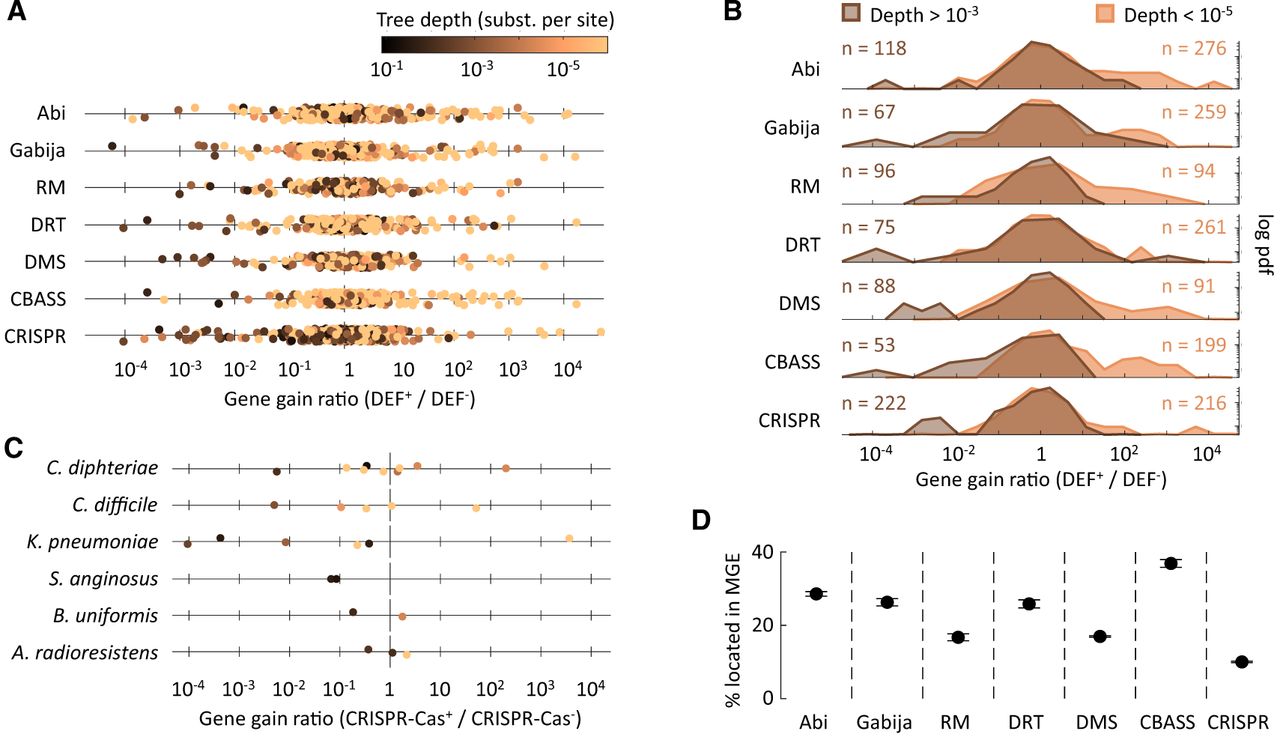 Association between defense systems and gene-gain rates depends on the timescale. (A) Ratio of overall gene-gain rates between sister clades that do and do not harbor defense systems (DEF+ and DEF−, respectively). Values greater (or smaller) than one indicate increased (or reduced) gene flux in lineages that contain the defense system. (B) Density distribution of the DEF+/DEF− gain ratios, comparing clades that represent recent acquisitions of the defense system (depth < 10−5 substitutions per site in core genes) and clades that have retained the defense system for longer times (depth > 10−3 substitutions per site). The probability density function (y-axis) is represented in logarithmic scale to facilitate the visualization of the tails. The skewness of all distributions is statistically significant (Supplemental Table S7), with positive values for recent clades and negative values for deeper clades. (C) Representative examples of gene-gain ratios in shallow and deeper sister groups from the same species. (D) Percentage of genes from different defense systems located within known MGEs. Whiskers represent 95% confidence intervals based on the binomial distribution.