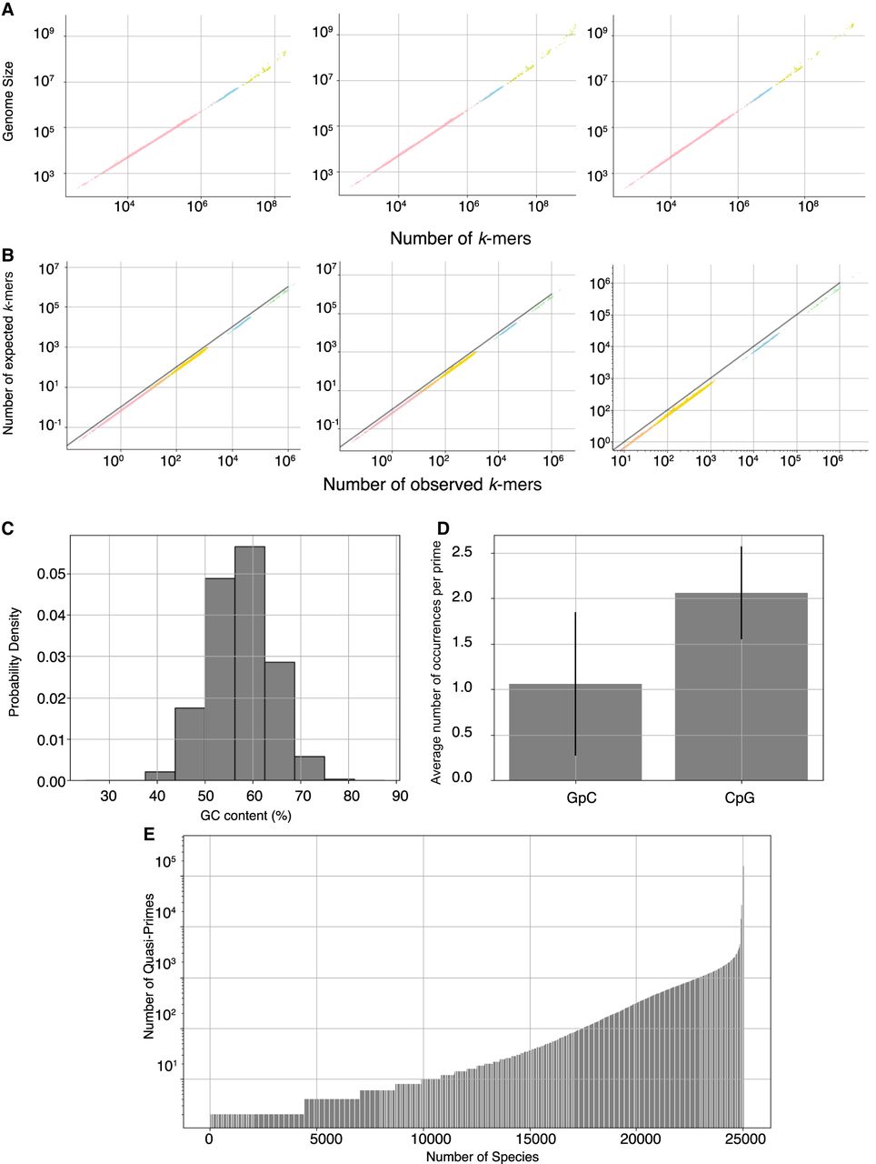 k-mer content as a function of genome length across organisms. (A) Number of different k-mers observed as a function of genome size for k-mer lengths of 15 bp, 16 bp, and 17 bp. (B) Number of expected versus the number of observed k-mers for each reference genome for k-mer lengths of 15 bp, 16 bp, and 17 bp. Viral, archaeal, bacterial, and eukaryotic genomes are colored pink, blue, yellow, and green, respectively, across the A and B figure panels. (C) GC content percentage of nucleic prime sequences. (D) Average number of GpC and CpG occurrences per prime. Error bars in D represent SD. (E) Number of quasi-primes detected in each reference genome.