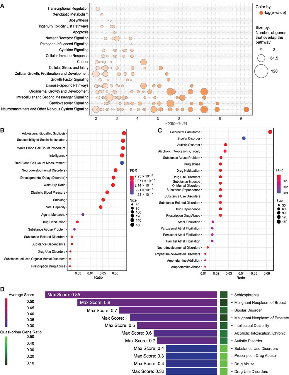 Functional and clinical disease associations of quasi-prime genes. (A) Bubble plot showing the enriched pathway categories from IPA analysis of quasi-prime genes. The size of each bubble represents the proportion of genes in the pathway having human quasi-primes, and the color represents the adjusted P-value of the enrichment. (B) DisGeNET enrichment dot plot showing the top characteristics associated with all quasi-prime genes present in “all” DisGeNET databases. (C) DisGeNET enrichment dot plot showing the top characteristics associated with all quasi-prime genes present in the “CURATED” DisGeNET database. The dots represent the characteristic association score, and the color represents the number of genes in common between the gene set and the disease/characteristic. (D) Gene disease bar plot presenting the count of associated genes across different disease conditions for all diseases with more than six associated genes. The average disease association score for all quasi-prime genes for a given disease within “all” DisGeNET databases is visualized in the color of the bar. The maximum score for all genes within a disease is displayed in text on figure. The number of quasi-prime genes out of the total genes annotated in the database is represented as a ratio shown in the heatmap tile.