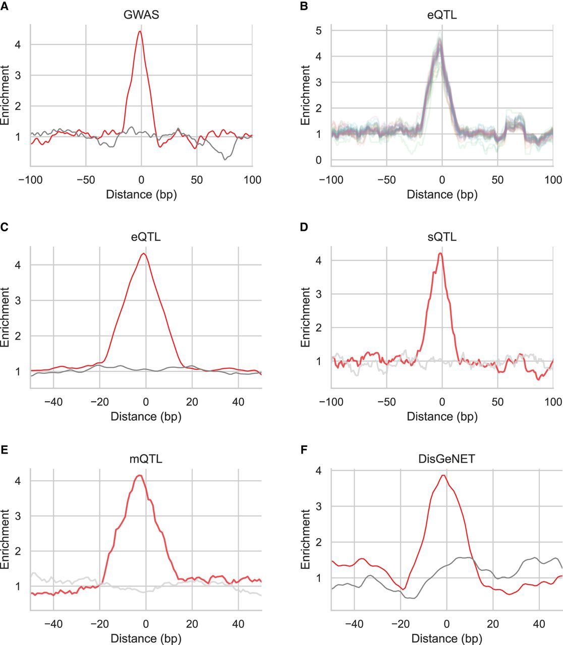Analysis of disruptive and regulatory variants. (A) Enrichment of human quasi-primes at and around GWAS variant loci. (B) Enrichment of human quasi-primes at and around eQTL loci. Each line represents a tissue. (C) Enrichment of human quasi-primes at and around multitissue eQTL loci. Enrichment of human quasi-primes at eQTL loci. (D) Enrichment of human quasi-primes at and around sQTL loci. (E) Enrichment of human quasi-primes at and around mQTL loci. (F) Enrichment of human quasi-primes at and around DisGeNET-derived loci. Gray lines represent the enrichment for simulated controls of human quasi-prime.