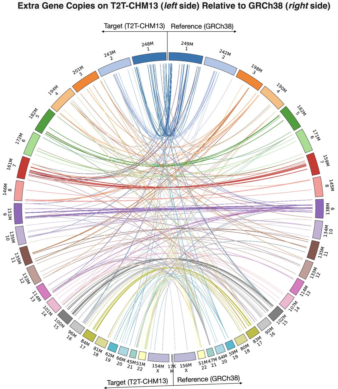 Plot illustrating the locations of extra gene copies found on T2T-CHM13 (left side) compared to GRCh38 (right side). The Circos plot was generated using pyCircos (https://github.com/ponnhide/pyCircos). Each line represents a gene copy mapped from the reference genome to the target genome, with colors indicating different chromosomes. The lines are color-coded by the chromosome of the original copy. The bands within the plot are sized proportionally to reflect the actual size of these chromosomes.