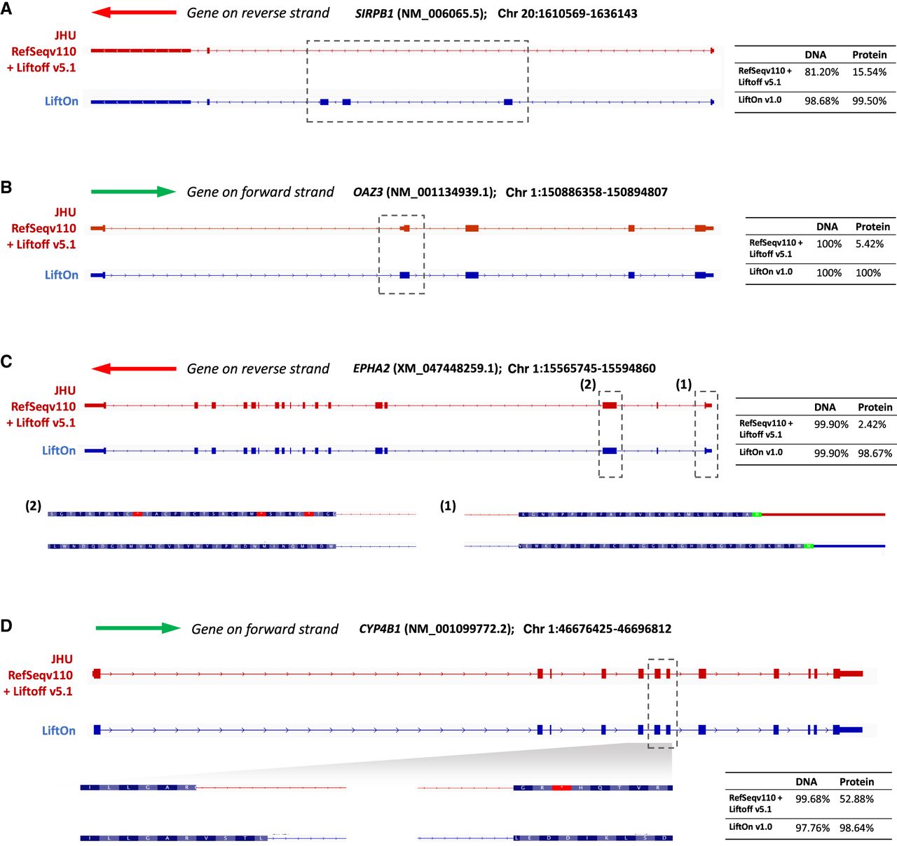 Examples in which LiftOn improves the current T2T-CHM13 annotation. (A) In the NM_006065.5 transcript of the SIRPB1 gene, the current CHM13 annotation omits three coding exons. The LiftOn version finds those exons and increases the DNA sequence identity from 81% to 98%. (B) In transcript NM_001134939.1 of OAZ3, the CHM13 annotation incorporates a partial CDS in the second exon, leading to a truncated protein. LiftOn corrects this misannotation, increasing the protein sequence identity from 5.42% to 100%. (C) In transcript XM_047448259.1 of EPHA2, the published annotation chooses the wrong start codon. LiftOn finds a better start codon that improves the protein sequence identity from 2.4% to 98.7%. (D) In transcript NM_001099772.2 from CYP4B1, LiftOn shifts the donor site of the seventh coding exon by 11 nucleotides, fixing a frameshift and improving the protein sequence identity from 53% to 99%.