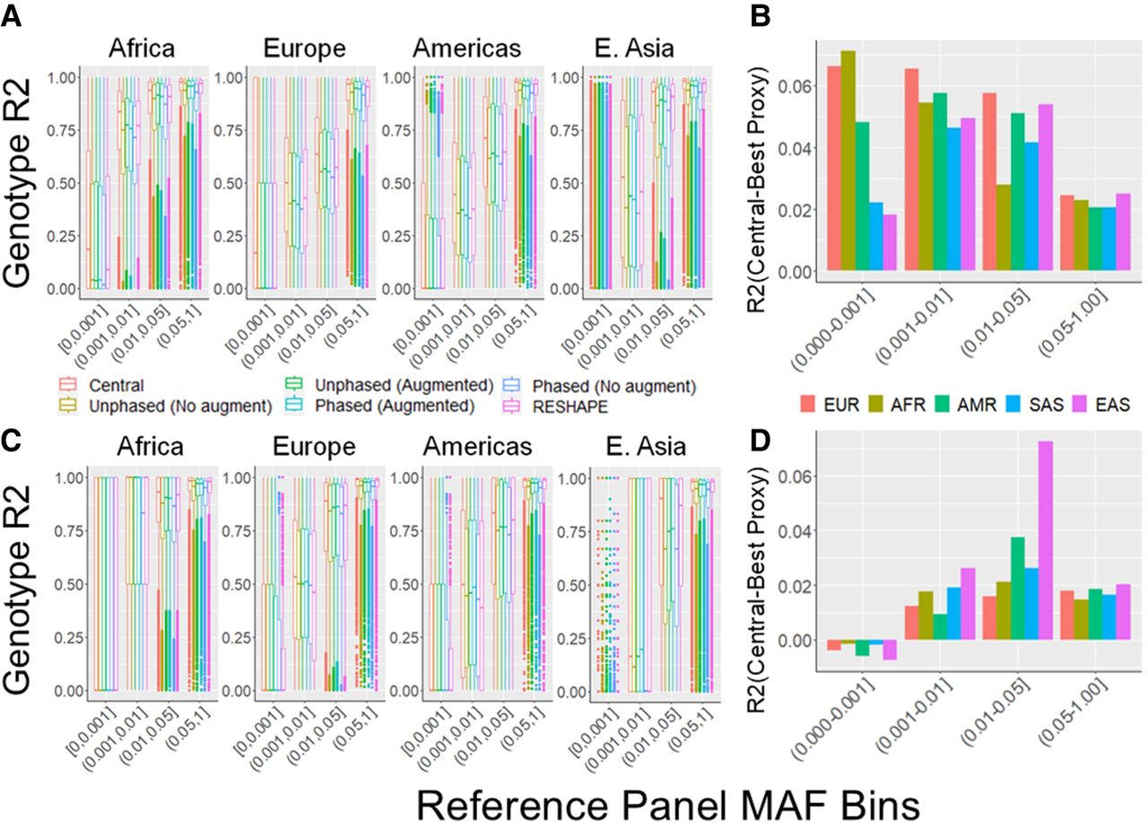 Population specific variant imputation accuracy. (A) Imputation accuracy for the variants on four superpopulations using HRC as the reference and 1000 Genomes as the query panel. Each box plot shows the genotype R2 distribution for the variants most frequently observed on the respective population. (B) The mean R2 difference between plaintext imputation and the unphased protocol at distinct allele frequency bins with HRC reference and 1000 Genomes as the query panel. Each bar corresponds to a population-specific variant set. (C) Imputation accuracy for population-specific variants using 1000 Genomes as the reference panel and GTEx as the query panel. (D) Mean genotype R2 difference between plaintext protocol and unphased protocol with 1000 Genomes as reference and GTEx panel as query.
