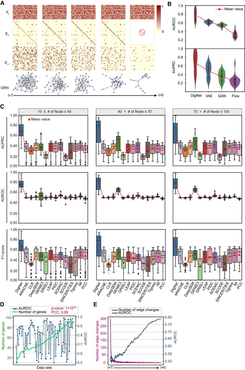 Benchmark evaluations of DigNet on simulation data sets. (A) The intermediate network illustration in progressively generating a clean network from a random network, where each column represents a snapshot in time, including the input data Xt, the predicted clean adjacency matrix E0, and the inferred output for the subsequent time-step Et−1. (B) Performance evaluation of DigNet compared with alternative generative models (diffusion vs. VAE, GAN, and Flow) in terms of AUROC and AUPRC. (C) Performance evaluation of DigNet and 13 other GRN inference algorithms using 100 synthetic data sets. The red line denotes the mean values of these comparison methods. (D) The evaluation for DigNet network generation capability on the size impact of the number of genes, using AUROC value with the calculation of t-test P-values and PCCs between them. (E) During the network generation, the comparison of the number of edges corrected by DigNet at different time points during network generation and its subsequent effect on the overall AUROC value.