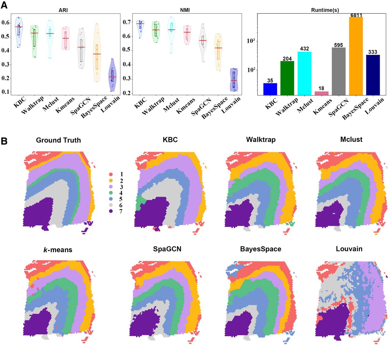 Second ablation study. Comparing different clustering algorithms using the same SpatialPCA embedding. (A) The violin plots show the ARI and NMI results of all 12 slices of DLPFC of the seven clustering algorithms. The runtimes are showed in a bar chart. (B) The detailed clustering results of different clustering methods are shown for the slice 151673. Only SpaGCN ran on GPU; others ran on CPU.