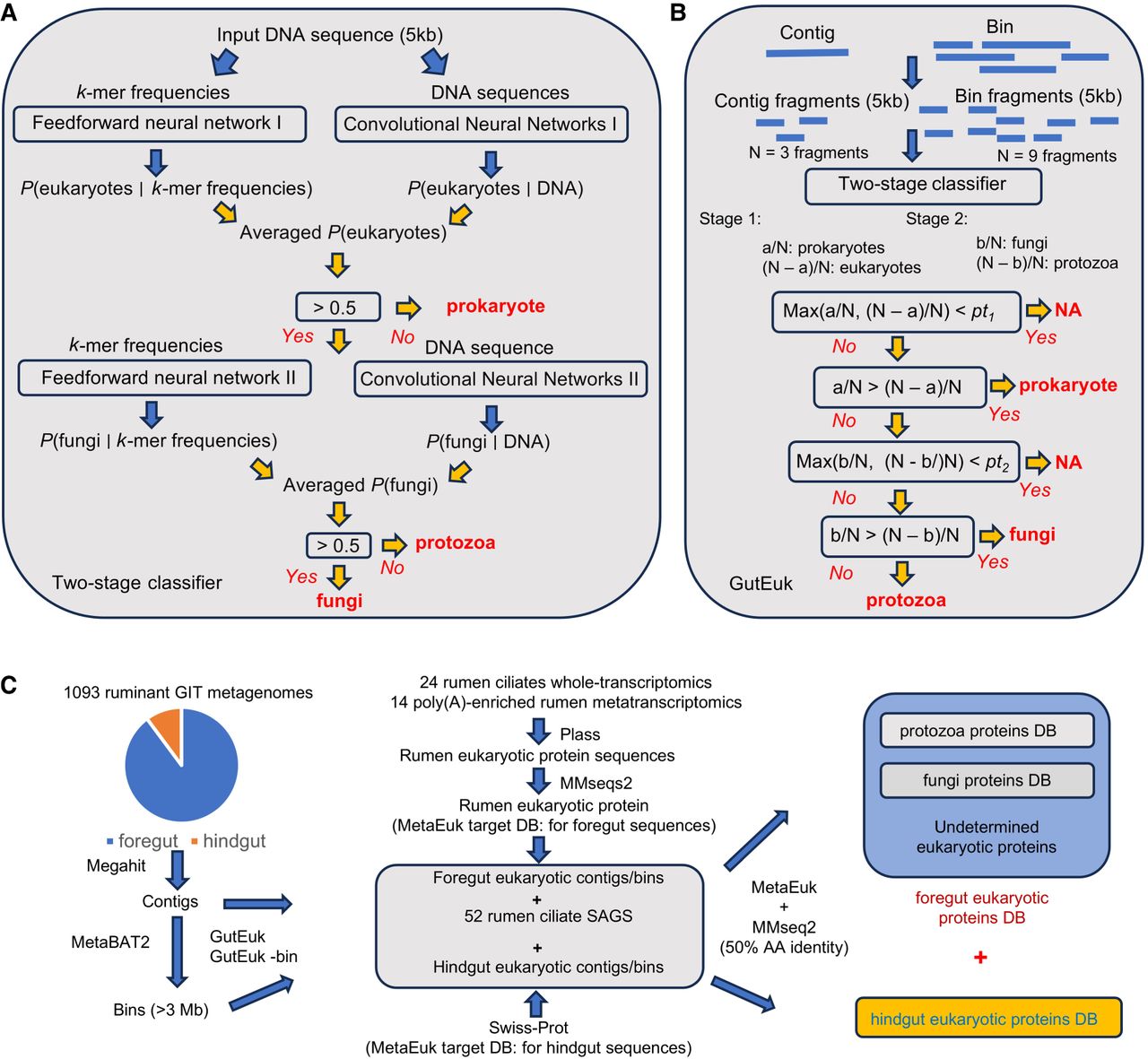 Illustrative schematic of the two-stage classification process used by GutEuk (A), the pipeline to classify individual contigs and bins from metagenomes (B), and the workflow to establish the ruminant foregut and hindgut eukaryotic protein databases (C).