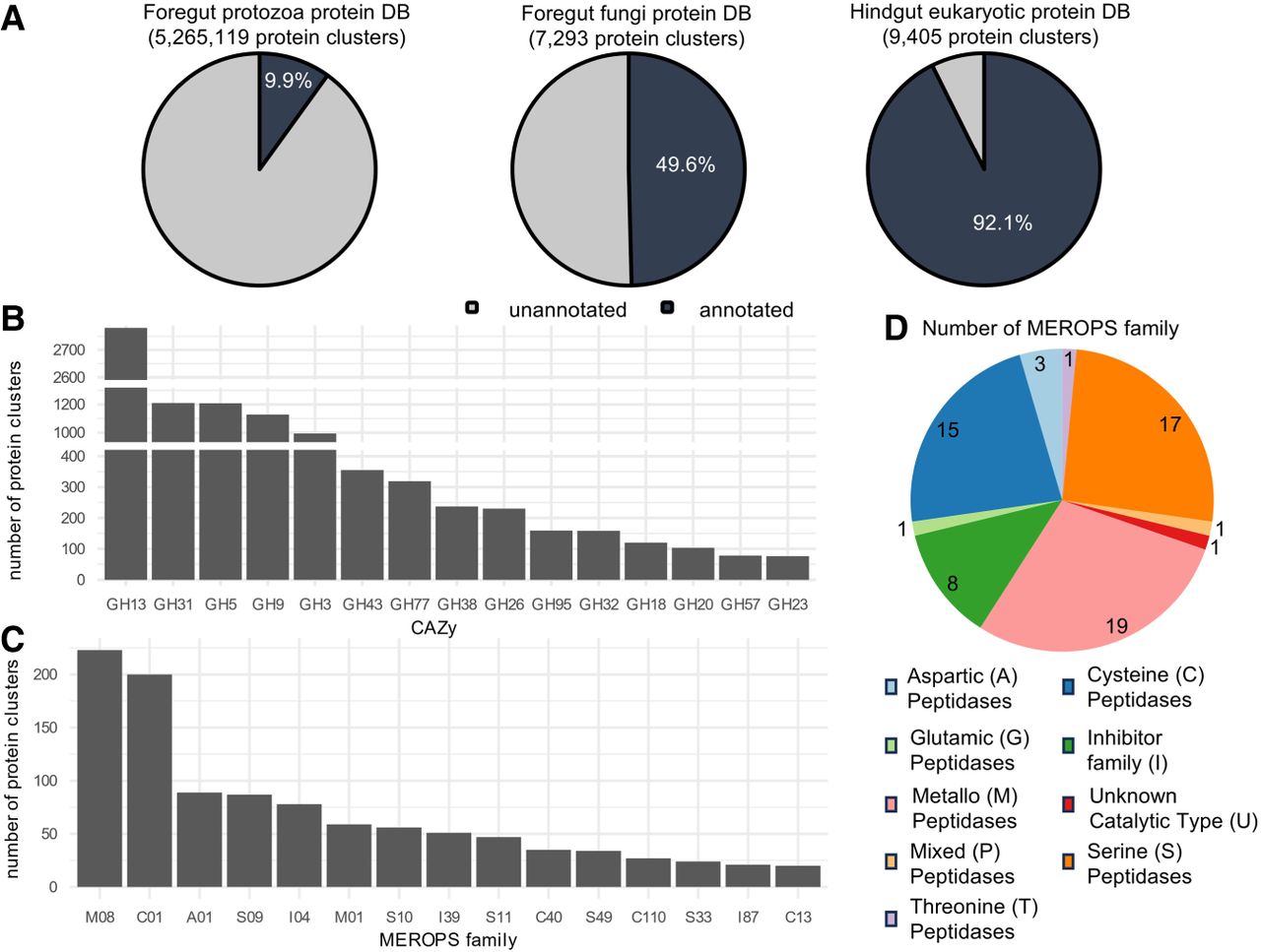 Diverse ruminant gut eukaryotic proteins identified in the databases. (A) The number of protein clusters identified in foregut protozoal, foregut fungal, and hindgut eukaryotic protein databases. (B) The most prevalent foregut protozoal glycoside hydrolases (GHs) identified. (C) The most prevalent foregut protozoal secretory (with identified signal peptides) peptidases and peptidase inhibitors identified. (D) The number of unique foregut protozoal secretory peptidases or peptidase inhibitors identified based on catalytic sites.