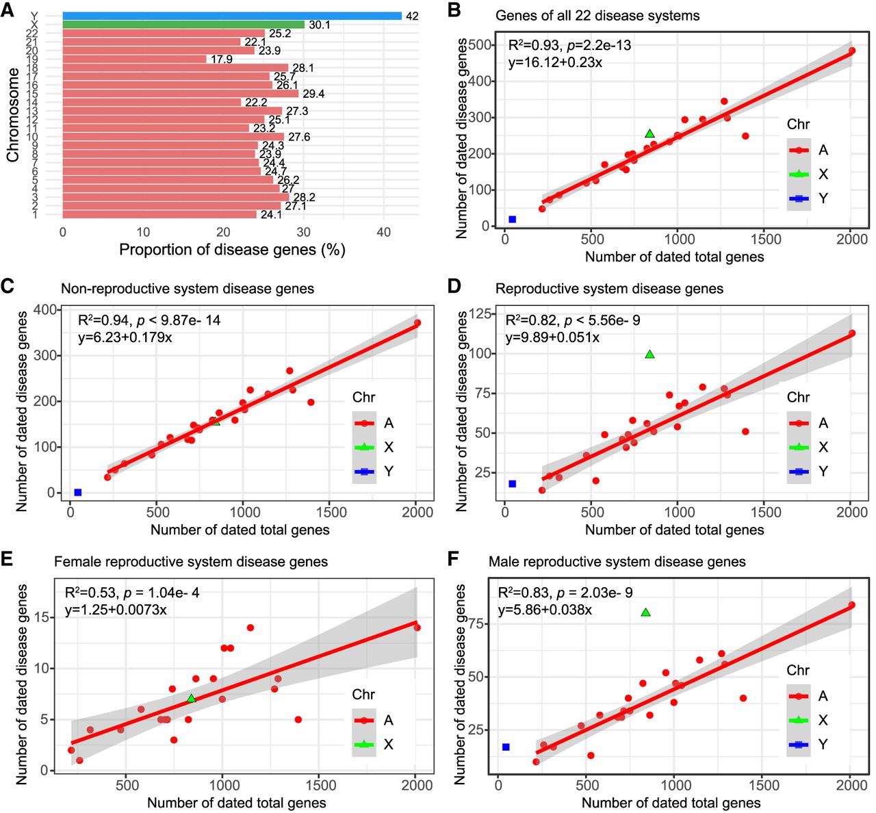Chromosomal analyses for disease genes. (A) The proportions of disease genes across chromosomes. The pink bars represent the autosomes, and green and blue indicate the X and Y Chromosomes, respectively. The proportions (%) for different chromosomes are shown above the bars. (B) The linear regression plotting of disease gene counts against the numbers of total genes with age information on chromosomes. (C) Numbers of genes related to the abnormality of nongenitourinary system (nonreproductive system) are plotted against all protein-coding genes on chromosomes with gene age information. (D) Numbers of genes related to the abnormality of genitourinary system (the reproductive system) are plotted against all protein-coding genes on chromosomes with gene age information. (E) Linear regression of dated disease gene counts against the total numbers of genes on chromosomes for female-specific reproductive disease genes with gene age information. (F) Linear regression of disease gene counts against the total numbers of genes on chromosomes for male-specific reproductive disease genes with gene age information. The autosomal linear models are displayed on the top left corner. Note that all linear regression formulas and statistics pertain only to autosomes. (A) Autosomes, (X) X Chromosomes, and (Y) Y Chromosomes.