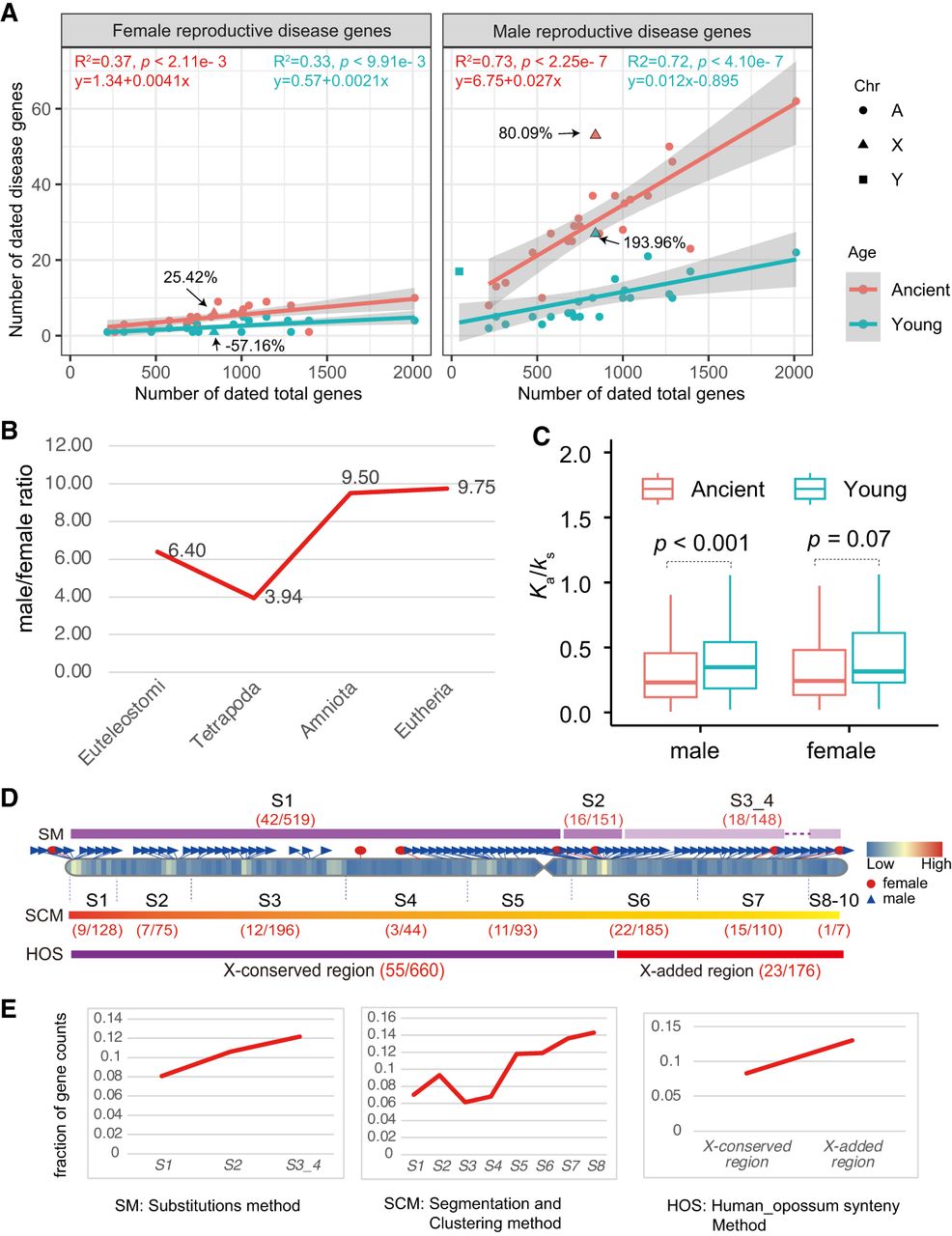 The X Chromosomal analyses for disease genes. (A) Numbers of female-specific (left) and male-specific reproductive disease genes (right) are plotted against all protein-coding genes with gene ages on chromosomes. The linear formulas fitted for autosomal genes at ancient (Euteleostomi) and younger (post-Euteleostomi) stages are shown in red and blue, respectively. The X Chromosome is shown with triangles. (B) The ratios of male to female reproductive disease gene numbers (α) across four phylostrata. (C) The comparison of selection pressure (human–chimpanzee pairwise Ka/Ks ratios) for sex-specific reproductive disease genes between the ancient (Euteleostomi or older) and younger (post-Euteleostomi) phylostrata. Only the autosomal comparison is shown, with P-value from the Wilcoxon test. (D) The numbers of male-specific reproductive disease genes (m) and the background genes (b) within the subregions from old to young in the X Chromosome are provided, with the numbers displayed within round brackets for each subregion (m/b). SM, SCM, and HOS denote three classification methods for X Chromosome structure: (SM) the substitutions method (Lahn and Page 1999; McLysaght 2008), (SCM) the segmentation and clustering method (Pandey et al. 2013), and (HOS) the synteny method (orthologous gene order conservation between human and opossum) (Ross et al. 2005). (E) The fraction of disease genes with male-specific reproductive disease phenotypes within each X Chromosomal subregion, as illustrated in D, is presented. The gene coordinates have been updated based on the hg38 reference with liftOver. (A) Autosomes, (X) X Chromosomes, and (Y) Y Chromosomes.