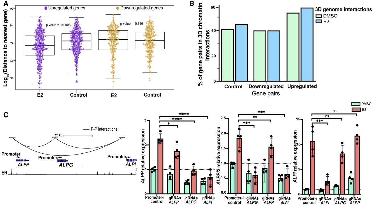 E2-upregulated gene promoters are enriched in physical interactions that can mediate their transcriptional response to estrogen. (A) The plot displays the genomic distances among E2-responsive genes or randomly selected control genes that match in the number of genes. Upregulated genes and matching control genes are shown in purple; downregulated genes and matching controls are shown in yellow. (B) Bar plot shows the percentage of E2-regulated or randomly selected (control) gene pairs within 150 kb that have promoter–promoter interactions (left, control genes; middle, downregulated genes; right, upregulated genes) observed under DMSO (green) or E2 (blue) treatment conditions. (C, left) Genome Browser tracks of ALPP-ALPG-ALPI gene cluster displaying promoter–promoter interactions and ER ChIP-seq signal. (Right) Relative expression with DMSO (green) or E2 (orange) treatment of each gene when the genes’ promoters in the cluster are targeted by Enhancer-i is displayed. Error bars represent the SD. (****) P < 0.00001, (***) P < 0.001, and (*) P < 0.05, unpaired t-test; (ns) statistical insignificance.