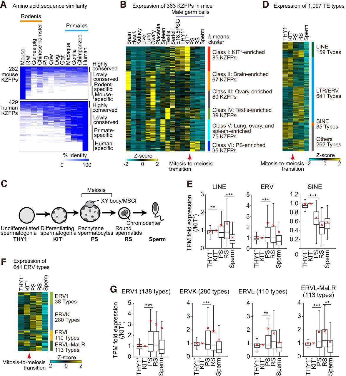 Expression of KZFPs and TEs during mouse spermatogenesis. (A) Amino acid sequence identities of 282 murine KZFPs (top) and 429 human KZFPs (bottom) among 12 mammalian species. All mouse and human KZFPs registered in the BioMart database (282 for mice and 429 for humans) were analyzed. (B) A heatmap showing a k-means clustering analysis of expression (RNA-seq data) for all protein-coding KZFPs in various tissues and testicular cell types in mice. (E18.5PGC) Prospermatogonia from E18.5 testis, (THY1+) THY1+ undifferentiated spermatogonia, (KIT+) KIT+ differentiating spermatogonia, (PS) pachytene spermatocytes, and (RS) round spermatids. (C) Schematic of mouse spermatogenesis and the five representative stages. (D) A heatmap showing the expression (RNA-seq data) of all detected TE types in male germ cells at the representative five stages. (E,G) Relative expression (RNA-seq data) of each TE class (E) and each ERV subclass (G) during spermatogenesis. Box-and-whisker plots showing distributions of RNA-seq read data. The central lines represent medians. The upper and lower hinges correspond to the 25th and 75th percentiles. The upper and lower whiskers are extended from the hinge to the largest value no further than the 1.5× inter-quartile range (IQR) from the hinge. The values of KIT+ were set to one. The red crosses represent the average values. Pairwise permutation ANOVA test (nonparametric test). (**) P < 0.01, (***) P < 0.001. (F) A heatmap showing the expression (RNA-seq data) of all ERV types in mouse spermatogenesis.