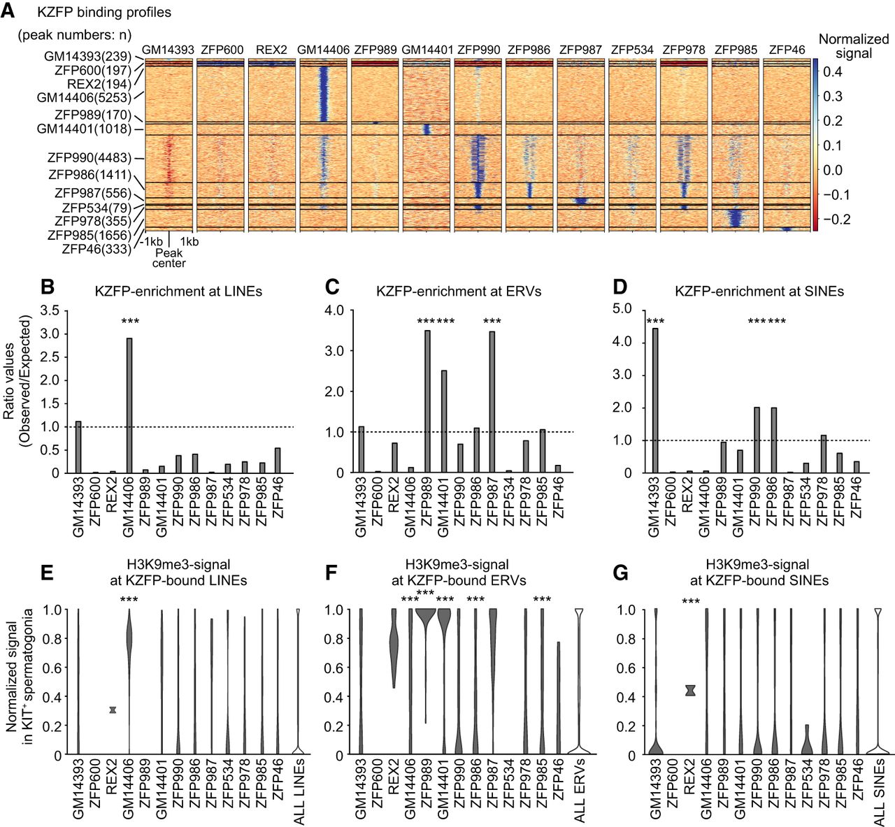 Binding preference of KIT+ spermatogonia-enriched KZFPs and the H3K9me3 enrichment. (A) Heatmap of the binding profiles of KIT+ spermatogonia-enriched KZFPs. The numbers in parentheses represent the numbers of detected peaks. (B–D) Binding preference of KZFPs at LINEs (B), LTRs (C), and SINEs (D). The bar plot represents the ratio value of the observed numbers of peaks versus the theoretically expected numbers of peaks. Binomial test. (***) P < 0.001. (E–G) Violin plots showing the data distribution of normalized H3K9me3 signals at each KZFP-bound LINEs (E), LTRs (F), and SINEs (G) compared with enrichment at all interspersed copies in KIT+ spermatogonia. The width of the plot illustrates the data density. Mann–Whitney U test. (***) P < 0.001.