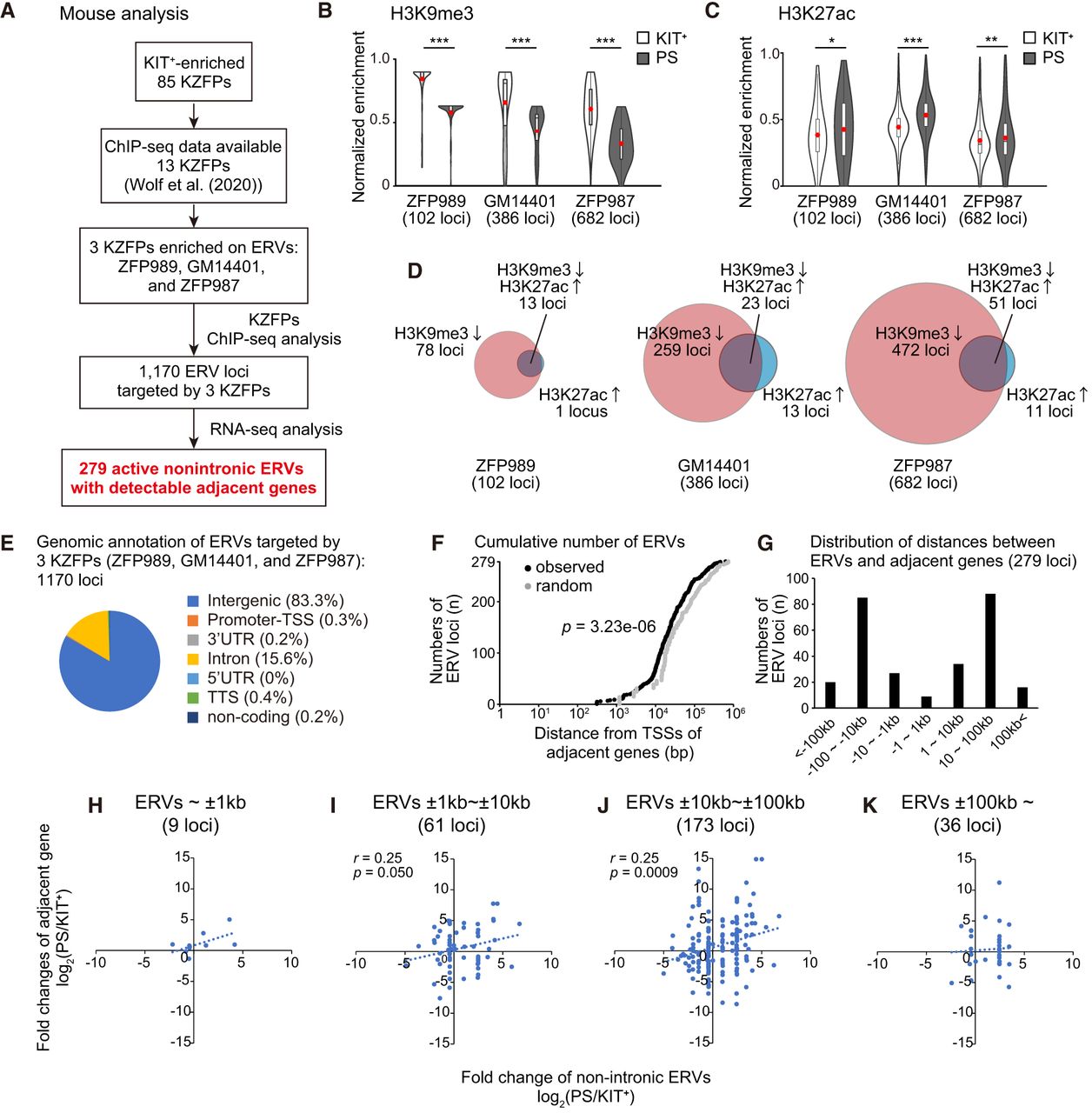 KZFPs target and suppress ERVs until the mitosis-to-meiosis transition. (A) Flowchart of analyses to identify target ERVs. (B,C) Normalized enrichment of H3K9me3 (B) and H3K27ac (C) at the target ERV loci in KIT+ and PS. Violin plot with a box plot overlay of the normalized enrichment of each histone modification. The central lines represent medians. The upper and lower hinges correspond to the 25th and 75th percentiles. The upper and lower whiskers are extended from the hinge to the largest value no further than the 1.5× inter-quartile range (IQR) from the hinge. The red dots in the box plot are the average of the normalized enrichment. Paired t-test. (***) P < 0.001, (**) P < 0.01, (*) P < 0.05. (D) Overlap between the target ERV loci at which H3K9me3 decreased and H3K27ac increased. (E) Genome annotation of the ERV loci targeted by ZFP989, GM14401, and ZFP987. Each proportion is shown in parentheses. (F) Cumulative curve of 279 active nonintronic ERVs targeted by ZFP989, GM14401, and ZFP987, based on the distances to the most adjacent TSSs. The gray dots represent the distance from randomly chosen ERVs to the most adjacent TSSs. D and P-value are calculated by the Kolmogorov–Smirnov test. (G) Distances between 279 active nonintronic ERVs targeted by ZFP989, GM14401, and ZFP987 and their adjacent genes. (H–K) Correlation between expression of the adjacent gene and nonintronic ERVs at the mitosis-to-meiosis transition (PS/KIT+). All nonintronic ERVs were separated into four groups according to the distance to the most adjacent genes. The correlation coefficient (r) and P-value were calculated on panels with more than 50 plots (I,J).
