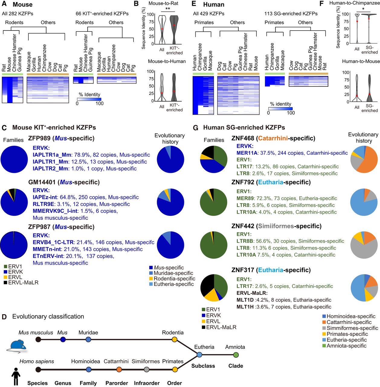 The evolutional aspects of KZFPs enriched in the mitotic spermatogonia. (A) The heatmap represents the identity of all 282 murine KZFPs (left) and 66 KIT+-enriched KZFPs (right) compared among mammalian species. The dendrogram represents the result of the hierarchical analysis, which categorizes all species into two groups. (B) The violin plot with a box plot overlay of the sequence identity of ALL KZFPs (white) and KIT+-enriched KZFPs (gray) between mice and rats (top) and mice and humans (bottom). The central lines represent medians. The upper and lower hinges correspond to the 25th and 75th percentiles. The upper and lower whiskers are extended from the hinge to the largest value no further than the 1.5X inter-quartile range (IQR) from the hinge. The red dots in the box plot are the average of the normalized enrichment. Mann–Whitney U test. (**) P < 0.01. (C) The left pie chart represents the proportion of subfamilies of target ERVs. The names of the ERV types shown in the middle represent the top three ERV types targeted by each KZFP. The right pie chart represents the proportion of evolutional ages of target ERVs. The evolutional history of each KZFP is shown in parentheses. (D) Schematics of evolutional clades for mice (top) and humans (bottom). (E) The heatmap represents the identity of all 429 murine KZFPs (left) and 113 KIT+-enriched KZFPs (right) compared among mammalian species. The dendrogram represents the result of the hierarchical analysis, which categorizes all species into two groups. (F) The violin plot with a box plot overlay of the sequence identity of All KZFPs (white) and KIT+-enriched KZFPs (gray) between humans and chimpanzees (top) and humans and mice (bottom). The central lines represent medians. The upper and lower hinges correspond to the 25th and 75th percentiles. The upper and lower whiskers are extended from the hinge to the largest value no further than the 1.5X IQR from the hinge. The red dots in the box plot are the average of the normalized enrichment. Mann–Whitney U test. (*) P < 0.05. (G) The evolutional age of four representative human SG-enriched KZFPs and their target ERVs. The left pie chart represents the proportion of subfamilies of target ERVs. The names of the ERV types shown in the middle represent the top three ERV types targeted by each KZFP. The right pie chart represents the proportion of evolutional ages of target ERVs.
