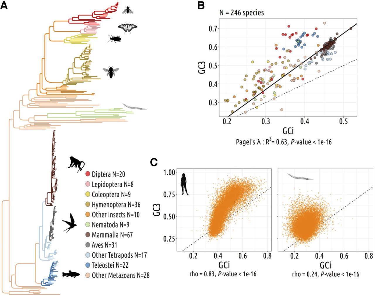 Codon usage variations are driven by nonadaptive processes. (A) Phylogenetic tree of the 257 studied species. (B) Gene average GC content at the third position of codons (GC3) and the gene average GC in introns (GCi) for each species. Pagel's lambda model is used to take into account the phylogenetic structure of the data in a regression model (black line). (C) Correlation between GC3 and GCi in Homo sapiens (left) and in Caenorhabditis elegans (right); each point corresponds to one gene. Spearman's rho and corresponding P-values are displayed under the graph. The dotted lines correspond to x = y.
