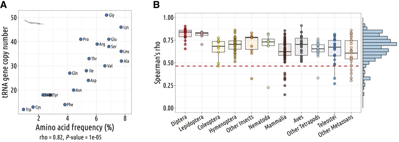 The tRNA gene copy number is a good predictor of the codon demand. (A) Representative example of the relationship between the number of isoacceptor tRNA gene copy per amino acid and the frequency of amino acid weighted by gene expression in C. elegans. Spearman's rho and corresponding P-value are displayed under the graph. (B) Boxplot showing the distribution of Spearman's correlation coefficients (ρ) from A for each species (N = 246 species). The red line indicates the threshold above which the P-value is lower than 0.05.