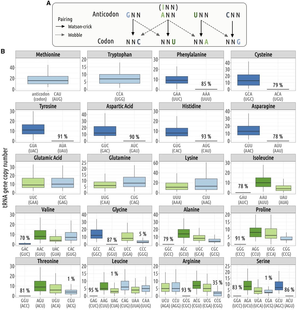 Codon–anticodon assignment. In each genome, we used the rules proposed by Percudani (2001) to assign codons to their cognate tRNA: First, isodecoder tRNAs present in a given genome are assigned to their complementary (Watson–Crick) codons, and then, the remaining codons (for which the genome does not contain any tRNA carrying the complementary anticodon) are inferred to be decoded by wobble pairing. (A) Illustration of the various possible pairings: Watson–Crick and wobble pairing. (B) Distribution of tRNA gene copy number across 223 species. The boxplot represents the median, interquartile range (box edges at 25th and 75th percentiles), and whiskers extending to the largest value no further than 1.5 times the interquartile range. For tRNA isodecoders that are absent from some genomes, the percentage of species in which they are missing is also indicated.