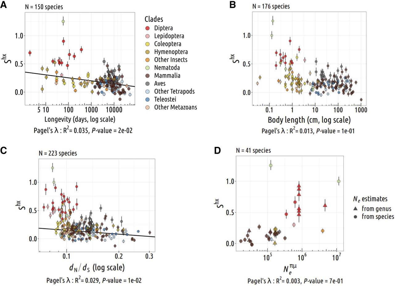 (D; N = 223 species). The TS intensity S is measured on the top 2% most highly expressed genes (Shx). Pagel's lambda model is used to take into account the phylogenetic structure of the data in a regression model (the regression